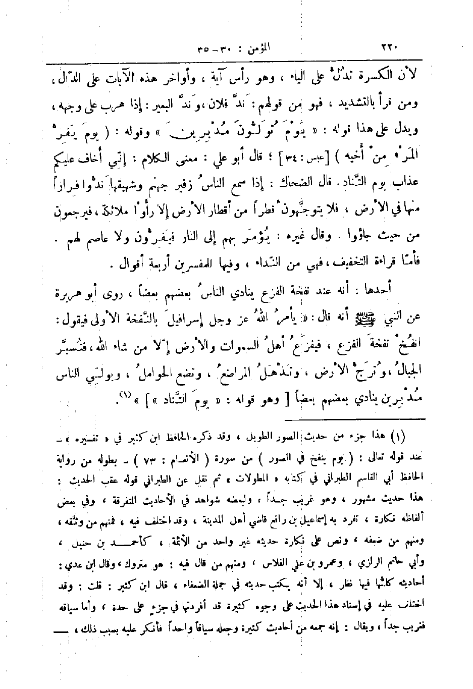 لأن الكسرة تدل على الياء وهو رأس آية وأواخر هذه الآيات على الدال ومن قرأ بالتشديد فهو من قولهم ند فلان وند البعير إذا هرب على وجهه ويدل على هذا قوله يوم تولون مدبرين وقوله يوم يفر المرء من أخيه عبس 34 قال أبو علي معنى الكلام إني أخاف عليكم عذاب يوم التناد قال الضحاك إذا سمع الناس زفير جهنم وشقيقها ندوا فرارا منها في الأرض فلا يتوجهون قطرا من أقطار الأرض إلا رأوا ملائكة فيرجعون من حيث جاؤوا وقال غيره يؤمر بهم إلى النار فيفرون ولا عاصم لهم فأما قراءة التخفيف فهي من النداء وفيها للفسرين أربعة أقوال