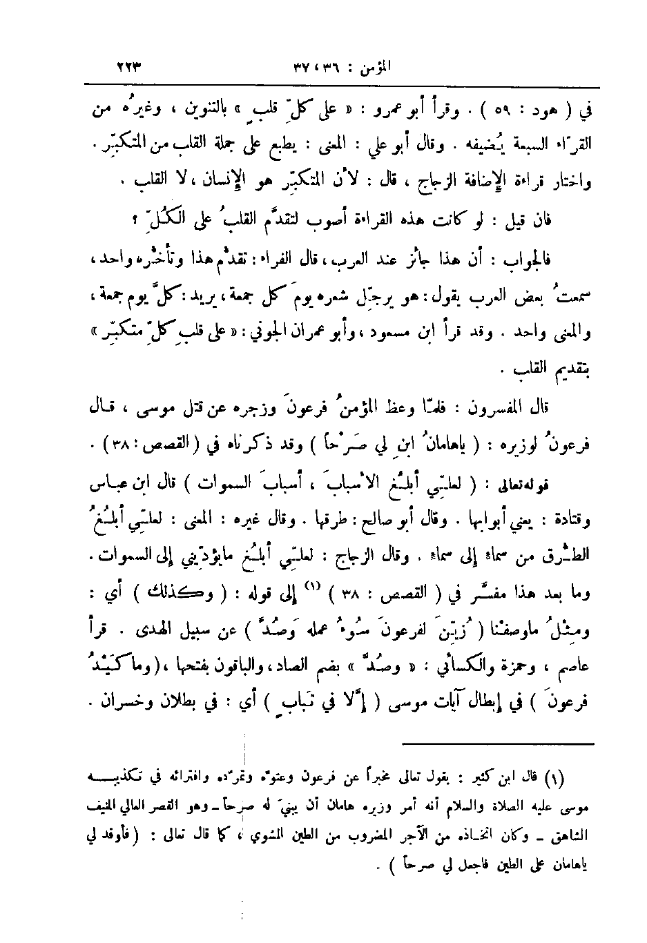 في هود 59 وقرأ أبو عمرو على كل قلب بالتنوين وغيره من القراء السبعة يضيفه وقال ابوعلي المعنى يطبع على جملة القلب من المتكبر واختار قراءة الإضافة الزجاج قال لأن المتكبر هو الإنسان لا القلب