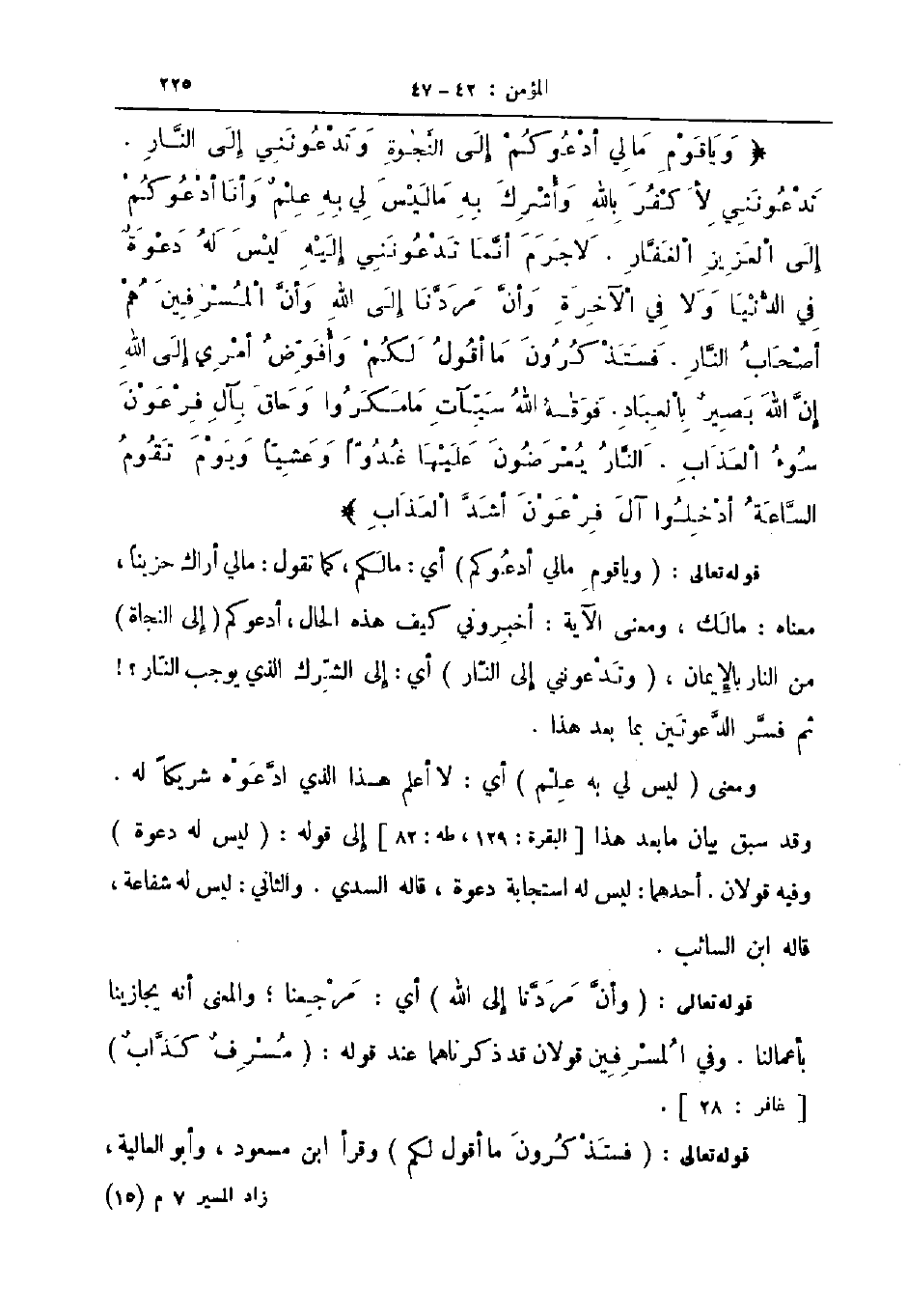 ويا قوم مالي أدعوكم إلى النجوة وتدعونني إلى النار تدعونني لأكفر بالله وأشرك به ما ليس لي به علم وأنا أدعوكم إلى العزيز الغفار لاجرم أنما تدعونني إليه ليس له دعوة في الدنيا ولا في الأخرة وأن مردنا إلى الله وان المسرفين هم اصحاب النار فستذكرون ما أقول لكم وأفوض أمري الى الله إن الله بصير بالعباد فوقاه الله سيآت مامكروا وحاق بآل فرعون سوء العذاب النار يعرضون عليها غدوا وعشيا ويوم تقوم الساعة ادخلوا آل فرعون أشد العذاب