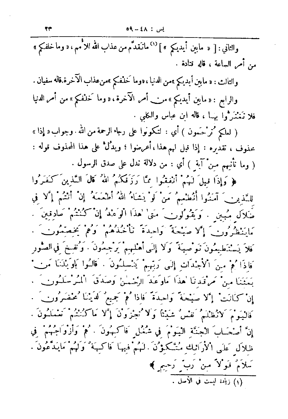 وإذا قيل لهم انفقوا مما رزقكم الله قال الذين كفروا للذين آمنوا أنطعم من لو يشاء الله أطعمه إن أنتم إلا في ضلال مبين ويقولون متى هذا الوعد إ ن كنتم صادقين ما ينظرون إلا صيحة واحدة تأخذهم وهم يخصمون فلا يستطيعون توصية ولا إلى أهلهم يرجعون ونفخ في الصور فاذا هم من الأجداث إلى ربهم ينسلون قالوا يا ويلتنا من بعثنا من مرقدنا هذا ما وعد الرحمن وصدق المرسلون إن كانت إلا صيحة واحدة فاذا هم جميع لدينا محضرون فاليوم لا تظلم نفس شيئا ولا تجزون إلا ما كنتم تعملون إن أصحاب الجنة اليوم في شغل فاكهون هم وأزواجهم في ظلال على الأرائك متكؤن لهم فيها فاكهة ولهم ما يدعون سلام قولا من رب رحيم