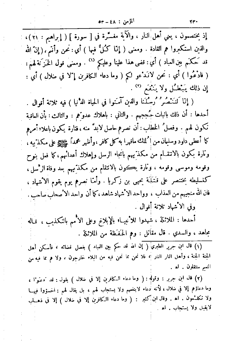 إذ يختصمون يعني أهل النار والآية مفسرة في سورة إبراهيم 21 والذين استكبروا هم القادة ومعنى إنا كل فيها أي نحن وأنتم إن الله قد حكم بين العباد أي قضى هذا علينا وعليكم ومعنى قول الخزنة لهم فادعوا أي نحن لا ندعو لكم وما دعاء الكافرين إلا في ضلال أي إن ذلك يبطل ولا ينفع