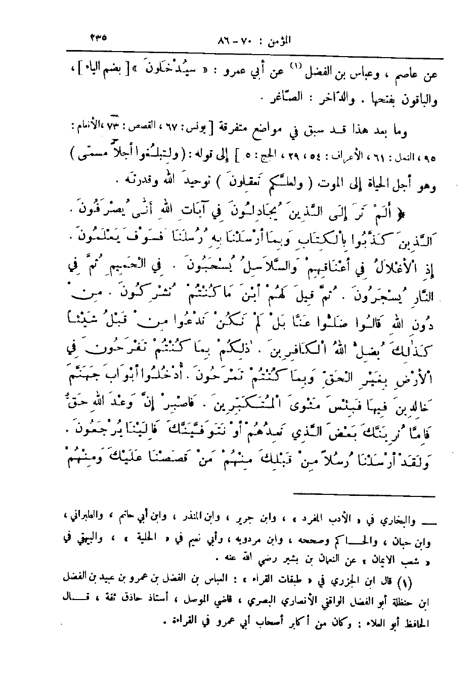 ألم تر إلى الذين يجادلون في آيات الله أنى يصرفون الذين كذبوا بالكتاب وبما أرسلنا به رسلنا فسوف يعلمون إذ الأغلال في أعناقهم والسلاسل يسحبون في الحميم ثم في النار يسجرون ثم قيل لهم أين ما كنتم تشركون من دون الله قالوا ضلوا عنا بل لم نكن ندعوا من قبل شيئا كذلك يضل الله الكافرين ذلكم بما كنتم تفرحون في الأرض بغير الحق وبما كنتم تمرحون أدخلوا أبواب جهنم خالدين فيها فبئس مثوى المتكبرين فاصبر إن وعد الله حق فاما نرينك بعض الذي نعدهم أو نتوفينك فالينا يرجعون ولقد أرسلنا رسلا من قبلك منهم من قصصنا عليك ومنهم