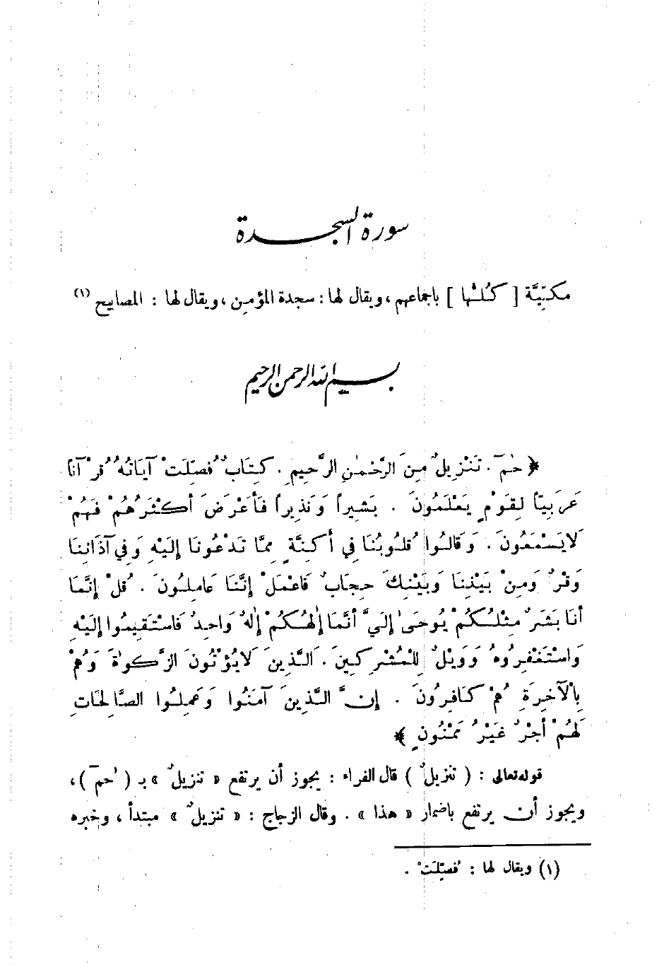 سورة السجدة مكية كلها باجماعهم ويقال لها سجدة المؤمن ويقال لها المصابيح بسم الله الرحمن الرحيم