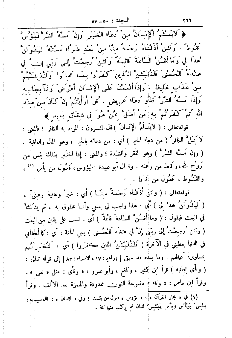 قوله تعالى لئن أذقناه رحمة منا أي خيرا وعافية وغنى ليقولن هذا لي أى هذا واجب لي بعملي وأنا محقوق به ثم يشك في البعث فيقول وما أظن الساعة قائمة أي لست على يقين من البعث ولئن رجعت إلى ربي إن لي عنده للحسنى يعني الجنة أي كما أعطاني في الدنيا يعطيني في الآخرة فلننبئن الذين كفروا أي لنخبرنهم بمساوئ أعمالهم وما بعده قد سبق إبراهيم 17 الإسراء 83 إلى قوله تعالى ونأى بجانبه قرأ ابن كثير ونافع وأبو عمرو ونأى مثل نعى وقرأ ابن عامر وناء مفتوحة النون ممدودة والهمزة بعد الألف وقرأ
