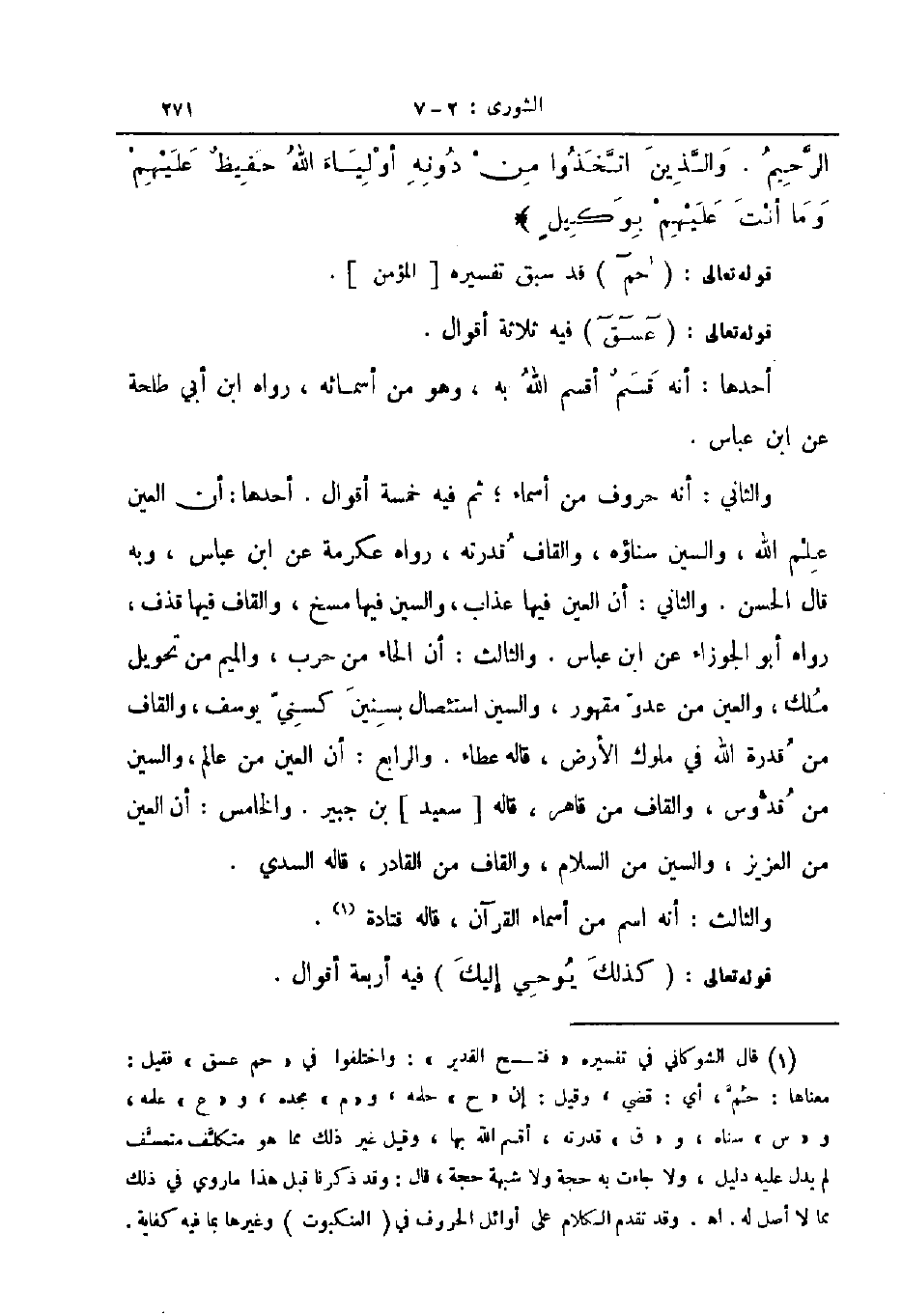 والثاني أنه حروف من أسماء ثم فيه خمسة أقوال أحدها أن العين علم الله والسين سناؤه والقاف قدرته رواه عكرمة عن ابن عباس وبه قال الحسن والثاني أن العين فيها عذاب والسين فيها مسخ والقاف فيها قذف رواه أبو الجوزاء عن ابن عباس والثالث أن الحاء من حرب والميم من تحويل ملك والعين من عدو مقهور والسين استئصال بسنين كسني يوسف والقاف من قدرة الله في ملوك الأرض قاله عطاء والرابع أن العين من عالم والسين من قدوس والقاف من قاهر قاله سعيد بن جبير والخامس أن العين من العزيز والسين من السلام والقاف من القادر قاله السدي