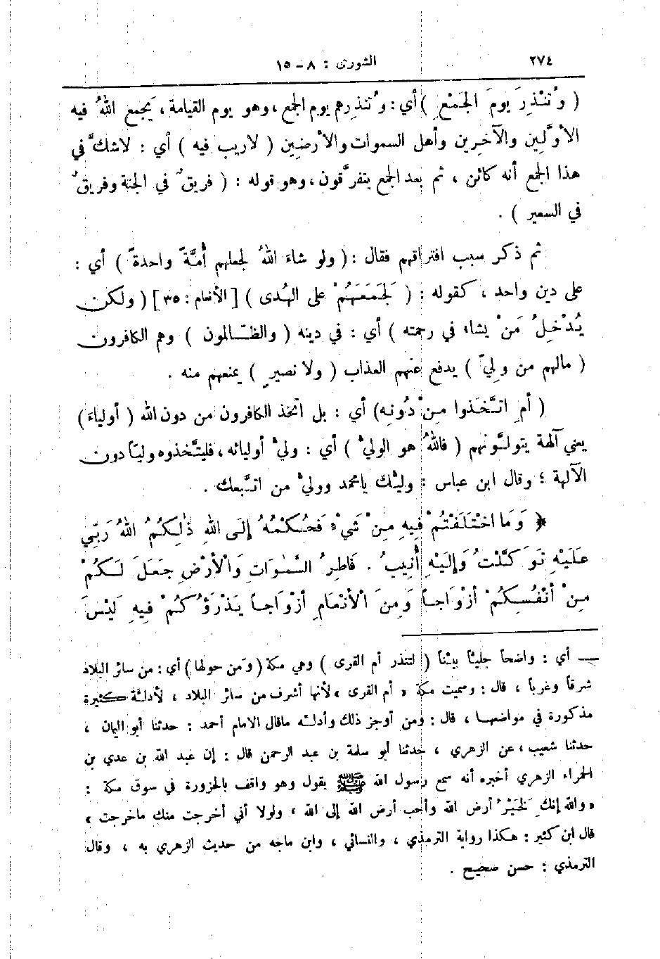 وتنذر يوم الجمع أي وتنذرهم يوم الجمع وهو يوم القيامة يجمع الله فيه الأولين والآخرين وأهل السموات والأرضين لا ريب فيه أي لا شك في هذا الجمع أنه كائن ثم بعد الجمع يتفرقون وهو قوله فريق في الجنة وفريق في السعير