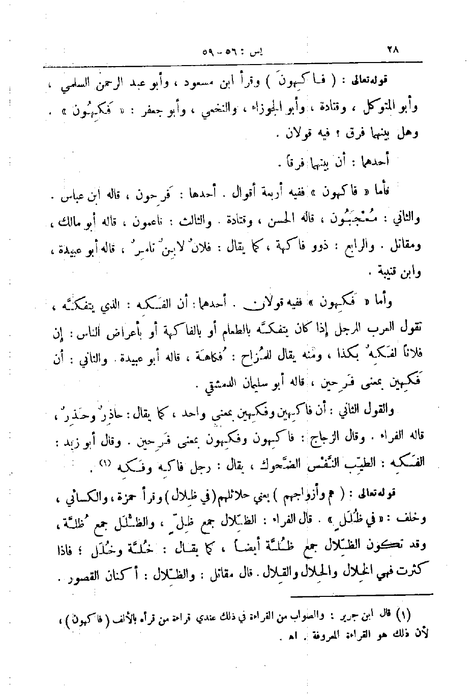 فأما فاكهون ففيه أربعه أقوال أحدها فرحون قاله ابن عباس والثاني معجبون قاله الحسن وقتادة والثالث ناعمون قاله أبو مالك ومقاتل والرابع ذوو فاكهة كما يقال فلان لابن تامر قاله أبو عبيدة وابن قتيبة