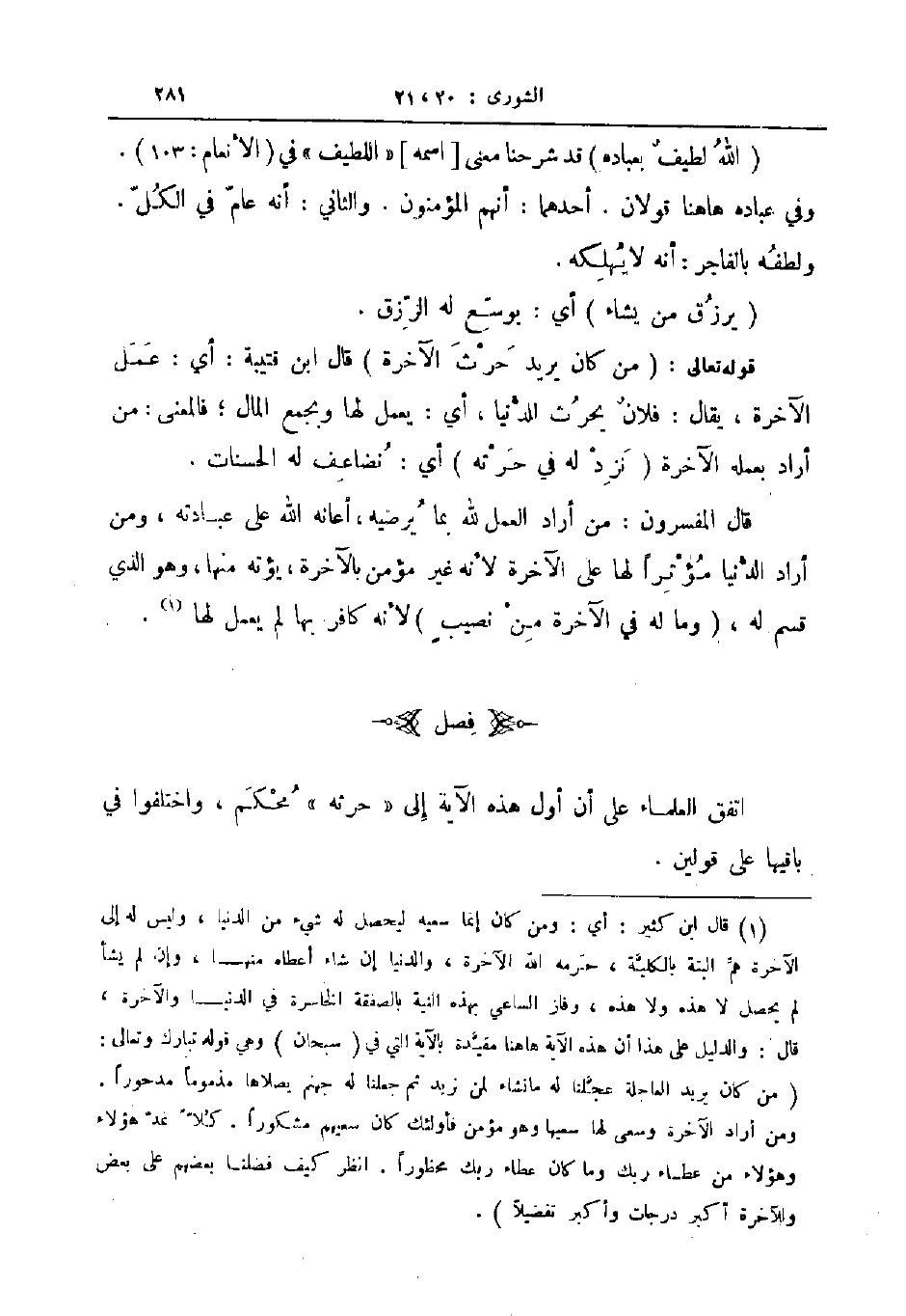 قال المفسرون من أراد العمل لله بما يرضيه أعانه الله على عبادته ومن أراد الدنيا مؤثرا لها على الآخرة لأنه غير مؤمن بالآخرة يؤته منها وهو الذي قسم له وما له في الآخرة من نصيب لأنه كافر بها لم يعمل لها فصل