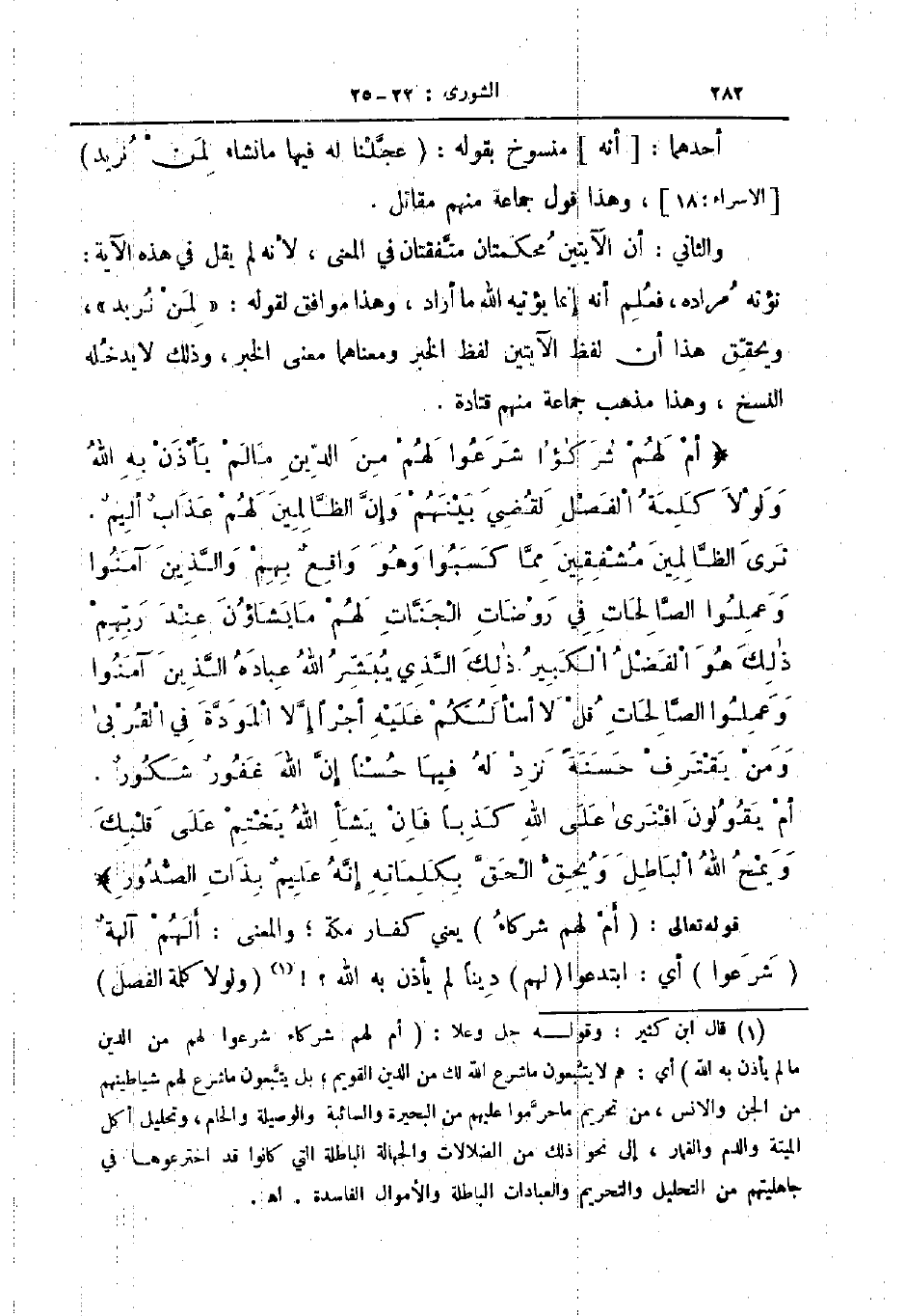 أم لهم شركاء شرعوا لهم من الدين ما لم يأذن به الله ولولا كلمة الفصل لقضي بينهم وإن الظالمين لهم عذاب أليم ترى الظالمين مشفقين مما كسبوا وهو واقع بهم والذين آمنوا وعملوا الصالحات في روضات الجنات لهم ما يشاؤن عند ربهم ذلك هو الفضل الكبير ذلك الذي يبشر الله عباده الذين آمنوا وعملوا الصالحات قل لا أسألكم عليه أجرا إلا المودة في القربى ومن يقترف حسنة نزد له فيها حسنا إن الله غفور شكور أم يقولون افترى على الله كذبا فإن يشأ الله يختم على قلبك ويمح الله الباطل ويحق الحق بكلماته إنه عليم بذات الصدور