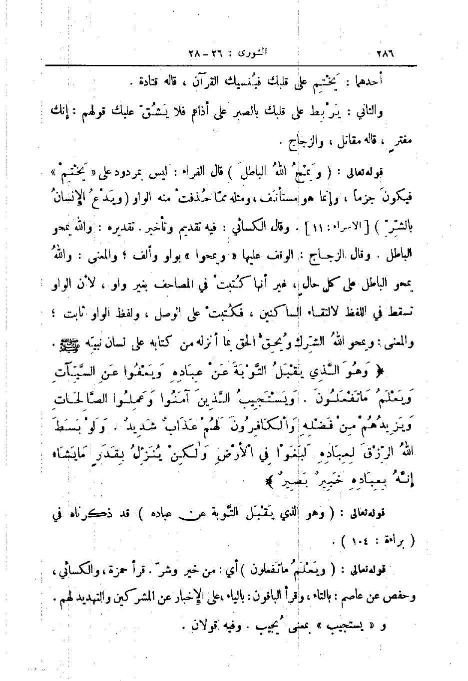 قوله تعالى ويمح الله الباطل قال الفراء ليس بمردود على يختم فيكون جزما وإنما هو مستأنف ومثله مما حذفت منه الواو ويدع الإنسان بالشر الاسراء 11 وقال الكسائي فيه تقديم وتأخير تقديره والله يمحو الباطل وقال الزجاج الوقف عليها ويمحوا بواو وألف والمعنى والله يمحو الباطل على كل حال غير أنها كتبت في المصاحف بغير واو لأن الواو تسقط في اللفظ لالتقاء الساكنين فكتبت على الوصل ولفظ الواو ثابت والمعنى ويمحو الله الشرك ويحق الحق بما أنزله من كتابه على لسان نبيه صلى الله عليه و سلم وهو الذي يقبل التوبة عن عبادة ويعفوا عن السيآت ويعلم ما تفعلون ويستجيب الذين آمنوا وعملوا الصالحات ويزيدهم من فضله والكافرون لهم عذاب شديد ولو بسط الله الرزق لعباده لبغوا في الأرض ولكن ينزل بقدر ما يشاء إنه بعباده خبير بصير