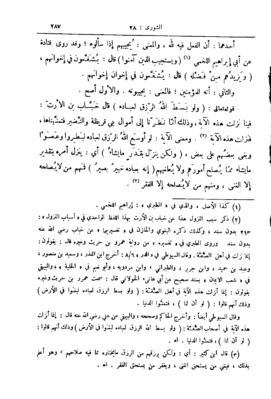 قوله تعالى ولو بسط الله الرزق لعباده قال خباب بن الأرت فينا نزلت هذه الآية وذلك أنا نظرنا إلى أموال بني قريظة والنضير فتمنيناها فنزلت هذه الآية ومعنى الآية لو أوسع الله الرزق لعباده لبطروا وعصوا وبغى بعضهم على بعض ولكن ينزل بقدر ما يشاء أي ينزل أمره بتقدير ما يشاء مما يصلح أمورهم ولا يطغيهم إنه بعباده خبير بصير فمنهم من لا يصلحه إلا الغنى ومنهم من لا يصلحه إلا الفقر