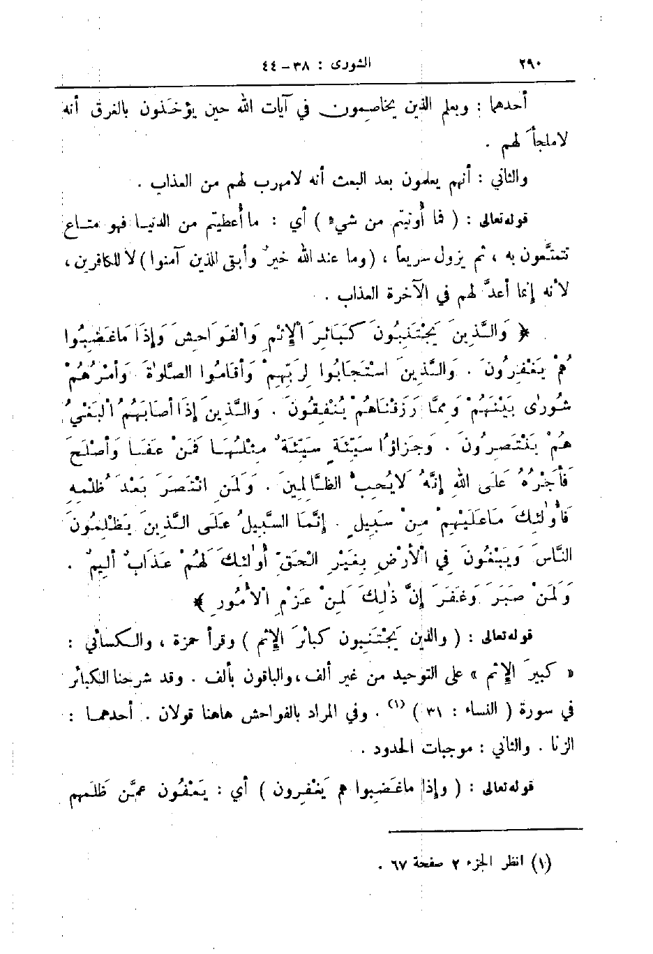 والذين يجتنبون كبائر الإثم والفواحش وإذا ما غضبوا هم يغفرون والذين استجابوا لربهم وأقاموا الصلاة وأمرهم شورى بينهم ومما رزقناهم ينفقون والذين إذا أصابهم البغي هم ينتصرون وجزاؤا سيئة سيئة مثلها فمن عفا وأصلح فأجره على الله إنه لا يحب الظالمين ولمن انتصر بعد ظلمه فأولئك ما عليهم من سبيل إنما السبيل على الذين يظلمون الناس ويبغون في الأرض بغير الحق أولئك لهم عذاب أليم ولمن صبر وغفر إن ذلك لمن عزم الأمور