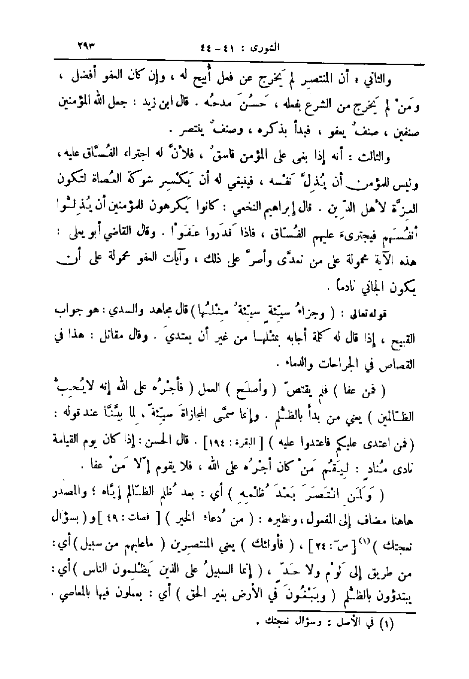 ولمن انتصر بعد ظلمه أي بعد ظلم الظالم إياه والمصدر هاهنا مضاف إلى المفعول ونظيره من دعاء الخير فصلت 49 و وبسؤال نعجتك ص 24 فأولئك يعني المنتصرين ما عليهم من سبيل أي من طريق إلى لوم ولا حد إنما السبيل على الذين يظلمون الناس أي يبتدؤون بالظلم ويبغون في الأرض بغير الحق أي يعملون فيها بالمعاصي