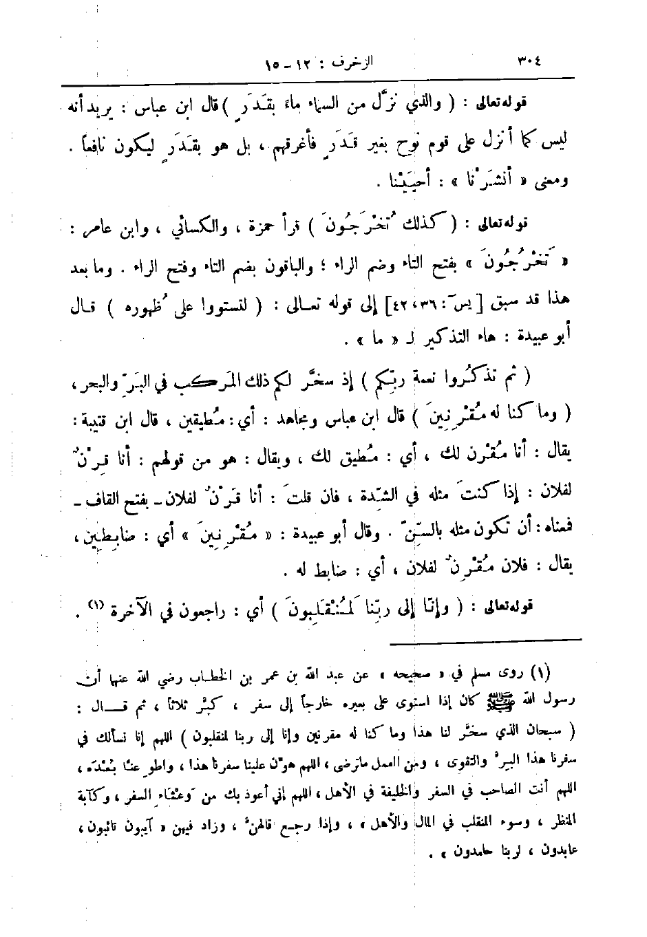 ثم تذكروا نعمة ربكم إذ سخر لكم ذلك المركب في البر والبحر وما كنا له مقرنين قال ابن عباس ومجاهد أي مطيقين قال ابن قتيبة يقال أنا مقرن لك أي مطيق لك ويقال هو من قولهم أنا قرن لفلان إذا كنت مثله في الشدة فان قلت أنا قرن لفلان بفتح القاف فمعناه أن تكون مثله بالسن وقال أبو عبيدة مقرنين أي ضابطين يقال فلان مقرن لفلان أي ضابط له