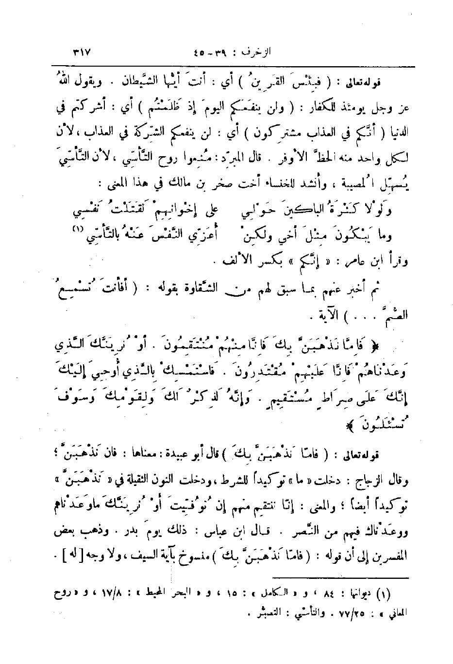 قوله تعالى فإما نذهبن بك قال أبو عبيدة معناها فإن نذهبن وقال الزجاج دخلت ما توكيدا للشرط ودخلت النون الثقيلة في نذهبن توكيدا أيضا والمعنى إنا ننتقم منهم إن توفيت أو نرينك ما وعدناهم ووعدناك فيهم من النصر قال ابن عباس ذلك يوم بدر وذهب بعض المفسرين إلى أن قوله فاما نذهبن بك منسوخ بآية السيف ولا وجه له