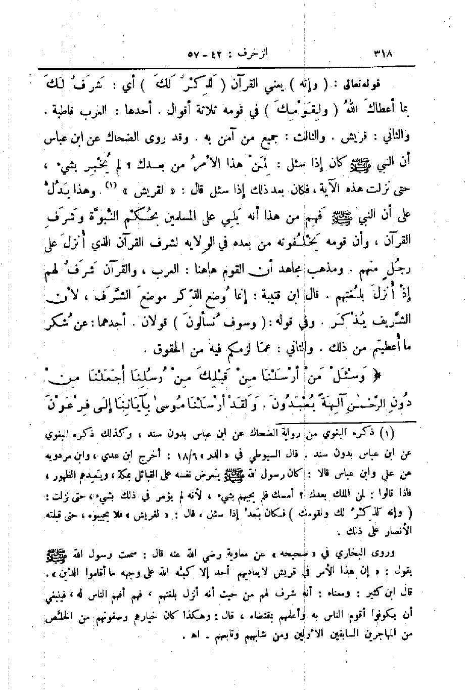 قوله تعالى وإنه يعني القرآن لذكر لك أي شرف لك بما أعطاك الله ولقومك في قومه ثلاثة أقوال أحدها العرب قاطبة والثاني قريش والثالث جميع من آمن به وقد روى الضحاك عن ابن عباس أن النبي صلى الله عليه و سلم كان إذا سئل لمن هذا الأمر من بعدك لم يخبر بشيء حتى نزلت هذه الآية فكان بعد ذلك إذا سئل قال لقريش وهذا يدل على أن النبي صلى الله عليه و سلم فهم من هذا أنه يلي على المسلمين بحكم النبوة وشرف القرآن وأن قومه يخلفونه من بعده في الولاية لشرف القرآن الذي أنزل على رجل منهم ومذهب مجاهد أن القوم هاهنا العرب والقرآن شرف لهم إذ أنزل بلغتهم قال ابن قتيبة إنما وضع الذكر موضع الشرف لأن الشريف يذكر وفي قوله وسوف تسألون قولان أحدهما عن شكر ما أعطيتم من ذلك والثاني عما لزمكم فيه من الحقوق وسئل من أرسلنا من قبلك من رسلنا أجعلنا من دون الرحمن آلهة يعبدون ولقد أرسلنا موسى بآياتنا إلى فرعون