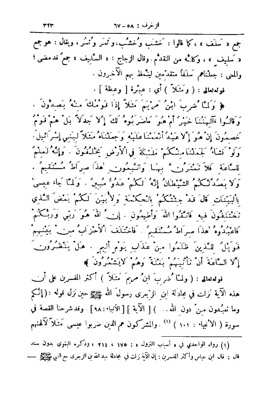 قوله تعالى ولما ضرب ابن مريم مثلا أكثر المفسرين على أن هذه الآية نزلت في مجادلة ابن الزبعري رسول الله صلى الله عليه و سلم حين نزل قوله إنكم وما تعبدون من دون الله الآية الأنبياء 98 وقد شرحنا القصة في سورة الأنبياء 101 والمشركون هم الذين ضربوا عيسى مثلا لآلهتهم