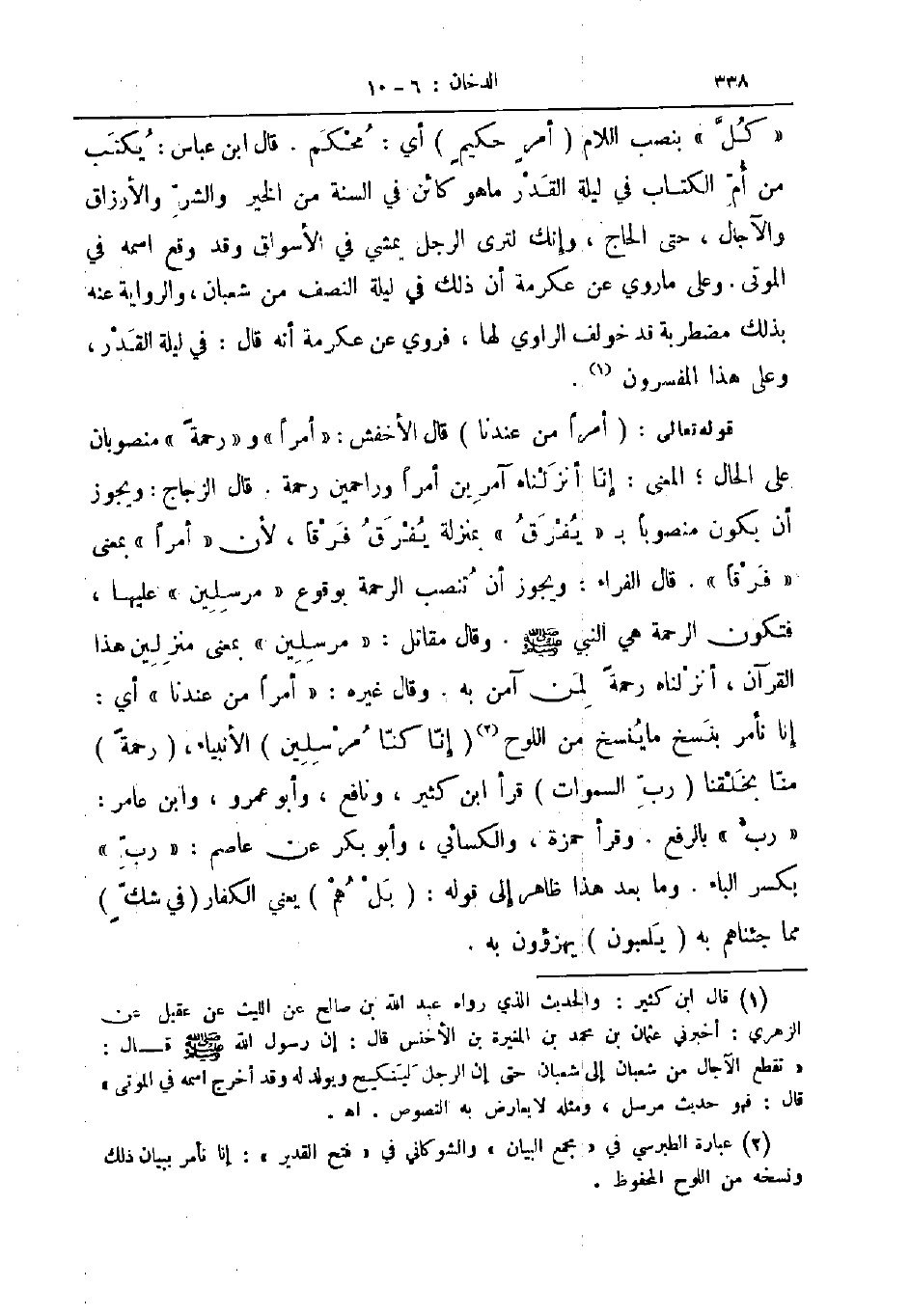كل بنصب اللام أمر حكيم أي محكم قال ابن عباس يكتب من ام الكتاب في ليلة القدر ماهو كائن في السنة من الخير والشر والأرزاق والآجال حتى الحاج وإنك لترى الرجل يمشي في الأسواق وقد وقع اسمه في الموتى وعلى ماروي عن عكرمة أن ذلك في ليلة النصف من شعبان والرواية عنه بذلك مضطربة قد خولف الراوي لها فروي عن عكرمة أنه قال في ليلة القدر وعلى هذا المفسرون