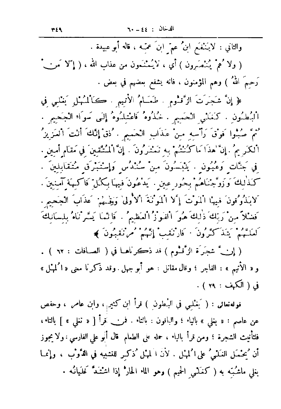 إن شجرة الزقوم قد ذكرناها في الصافات 62 والأثيم الفاجر وقال مقاتل هو أبو جهل وقد ذكرنا معنى المهل في الكهف 29