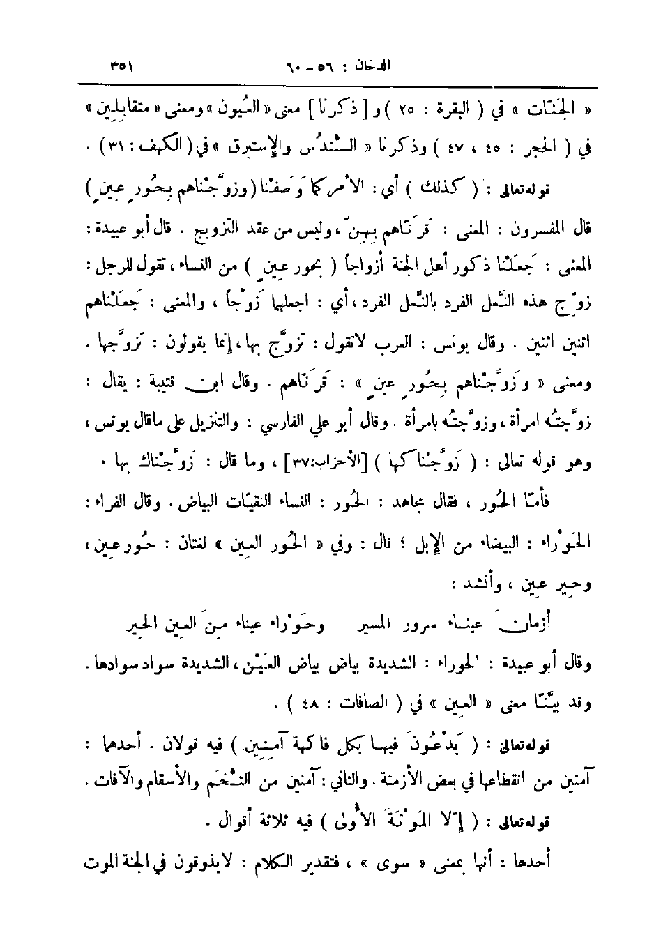 فأما الحور فقال مجاهد الحور النساء النقيات البياض وقال الفراء الحوراء البيضاء من الإبل قال وفي الحور العين لغتان حور عين وحير عين وأنشد ... أزمان عيناء سرور المسير ... وحوراء عيناء من العين الحير ...
