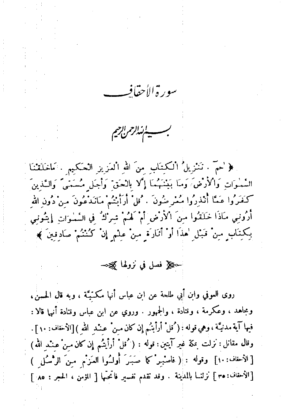روى العوفي وابن أبي طلحة عن ابن عباس أنها مكية وبه قال الحسن ومجاهد وعكرمة وقتادة والجمهور وروي عن ابن عباس وقتادة أنهما قالا فيها آية مدنية وهي قوله قل أرأيتم إن كان من عند الله الأحقاف 10 وقال مقاتل نزلت بمكة غير آيتين قوله قل أرأيتم إن كان من عند الله الأحقاف 10 وقوله فاصبر كما صبر أولوا العزم من الرسل الأحقاف 35 نزلتا بالمدينة وقد تقدم تفسير فاتحتها المؤمن الحجر 85