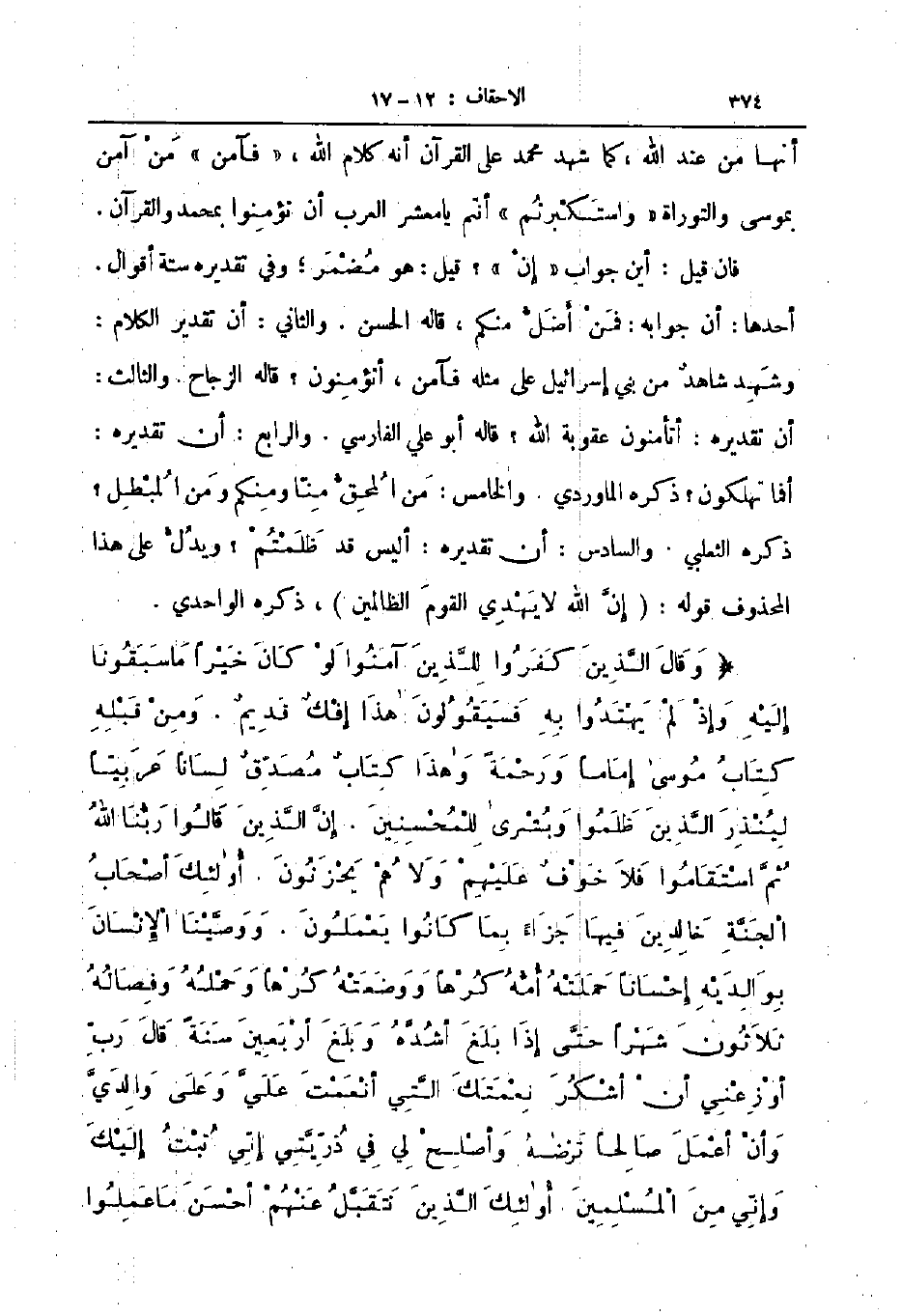 وقال الذي كفروا للذين آمنوا لو كان خيرا ما سبقونا إليه وإذ لم يهتدوا به فسيقولون هذا إفك قديم ومن قبله كتاب موسى إماما ورحمة وهذا كتاب مصدق لسانا عربيا لينذر الذين ظلموا وبشرى للمحسنين إن الذين قالوا ربنا الله ثم استقاموا فلا خوف عليهم ولا هم يحزنون أولئك أصحاب الجنة خالدين فيها جزاء بما كانوا يعملون ووصينا الإنسان بوالديه إحسانا حملته أمه كرها ووضعته كرها وحمله وفصاله ثلاثون شهرا حتى إذا بلغ أشده وبلغ أربعين سنة قال رب أوزعني أن أشكر نعمتك التي أنعمت علي وعلى والدي وان أعمل صالحا ترضاه وأصلح لي في ذريتي إني تبت إليك وإني من المسلمين أولئك الذي نتقبل عنهم أحسن ما عملوا