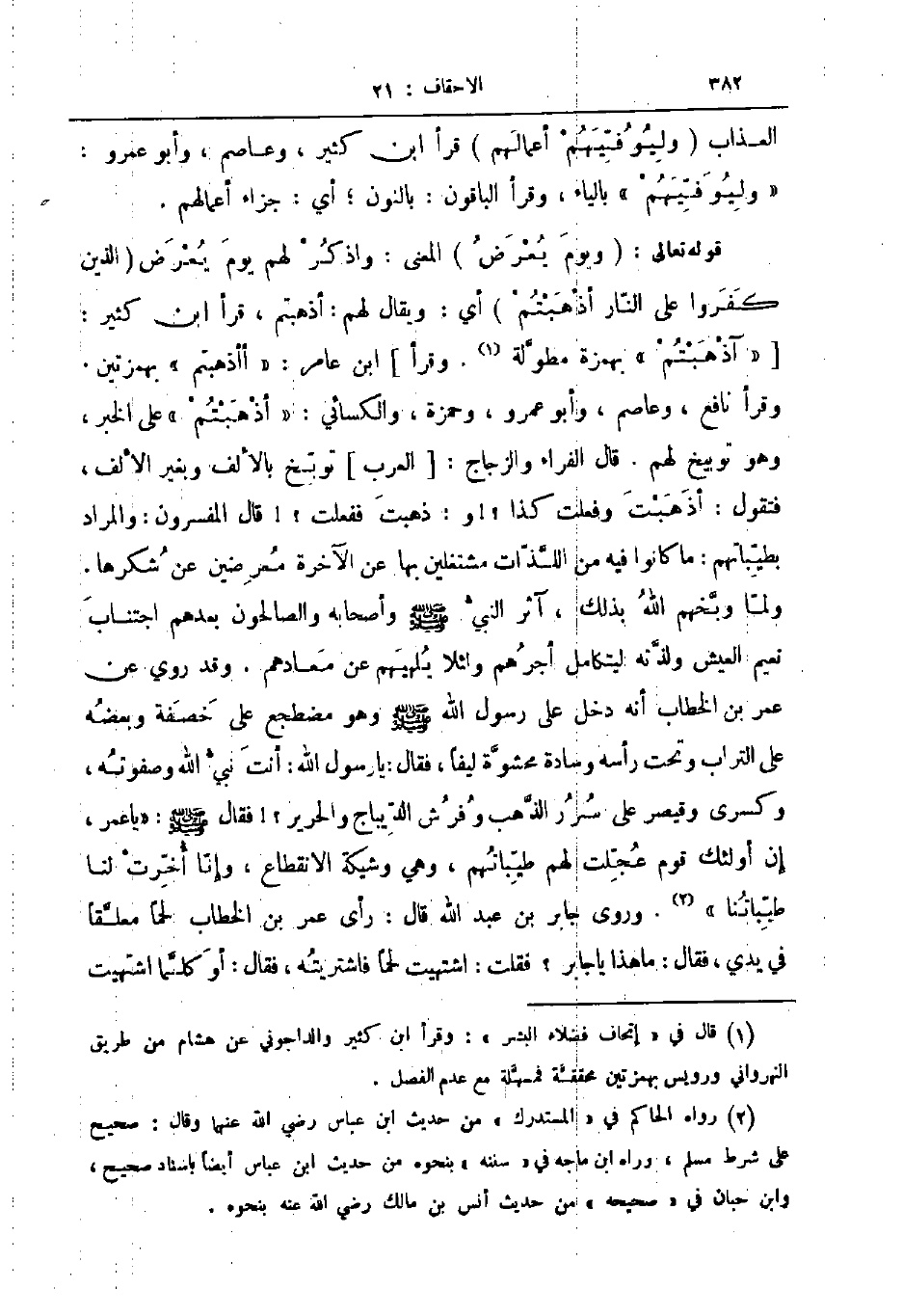 قوله تعالى ويوم يعرض المعنى واذكر لهم يوم يعرض الذين كفروا على النار أذهبتم أي ويقال لهم أذهبتم قرأ ابن كثير آذهبتم بهمزة مطولة وقرأ ابن عامر أأذهبتم بهمزتين وقرأ نافع وعاصم وأبو عمرو وحمزة والكسائي أذهبتم على الخبر وهو توبيخ لهم قال الفراء والزجاج العرب توبخ بالألف وبغير الأف فتقول أذهبت وفعلت كذا وذهبت ففعلت قال المفسرون والمراد بطيباتهم ما كانوا فيه من اللذات مشتغلين بها عن الآخرة معرضين عن شكرها ولما وبخهم الله بذلك آثر النبي صلى الله عليه و سلم وأصحابه والصالحون بعدهم اجتناب نعيم العيش ولذته ليتكامل أجرهم ولئلا يلهيهم عن معادهم وقد روي عن عمر بن الخطاب أنه دخل على رسول الله صلى الله عليه و سلم وهو مضطجع على خصفة وبعضه على التراب وتحت رأسه وسادة محشوة ليفا فقال يا رسول الله أنت نبي الله وصفوته وكسرى وقيصر على سرر الذهب وفرش الديباج والحرير فقال صلى الله عليه و سلم يا عمر إن أولئك قوم عجلت لهم طيباتهم وهي وشيكة الانقطاع وإنا أخرت لنا طيباتنا وروى جابر بن عبد الله قال رأى عمر بن الخطاب لحما معلقا في يدي فقال ما هذا ياجابر فقلت اشتهيت لحما فاشتريته فقال أو كلما اشتهيت