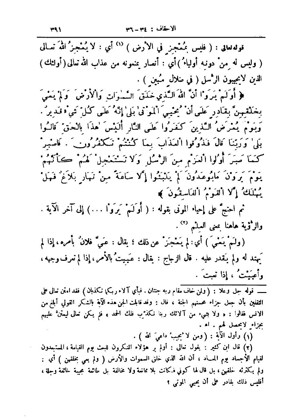 قوله تعالى فليس بمعجز في الأرض أي لا يعجز الله تعالى وليس له من دونه أولياء أي أنصار يمنعونه من عذاب الله تعالى أولئك الذين لا يجيبون الرسل في ضلال مبين أولم يروا أن الله الذي خلق السموات والأرض ولم يعي بخلقهن بقادر على أن يحيي الموتى بلى إنه على كل شيء قدير ويوم يعرض الذين كفروا على النار أليس هذا بالحق قالوا بلى وربنا قال فذوقوا العذاب بما كنتم تكفرون فاصبر كما صبر أولوا العزم من الرسل ولا تستعجل لهم كأنهم يوم يرون ما يوعدون لم يلبثوا إلا ساعة من نهار بلاغ فهل يهلك إلا القوم الفاسقون