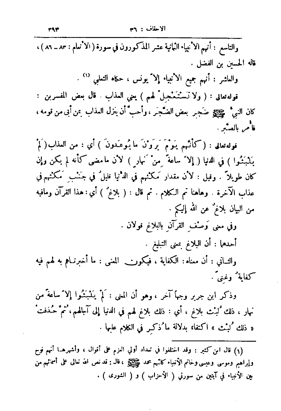 وذكر ابن جرير وجها آخر وهو أن المعنى لم يلبثوا إلا ساعة من نهار ذلك لبث بلاغ أي ذلك بلاغ لهم في الدنيا إلى آجالهم ثم حذفت ذلك لبث اكتفاء بدلالة ما ذكر في الكلام عليها