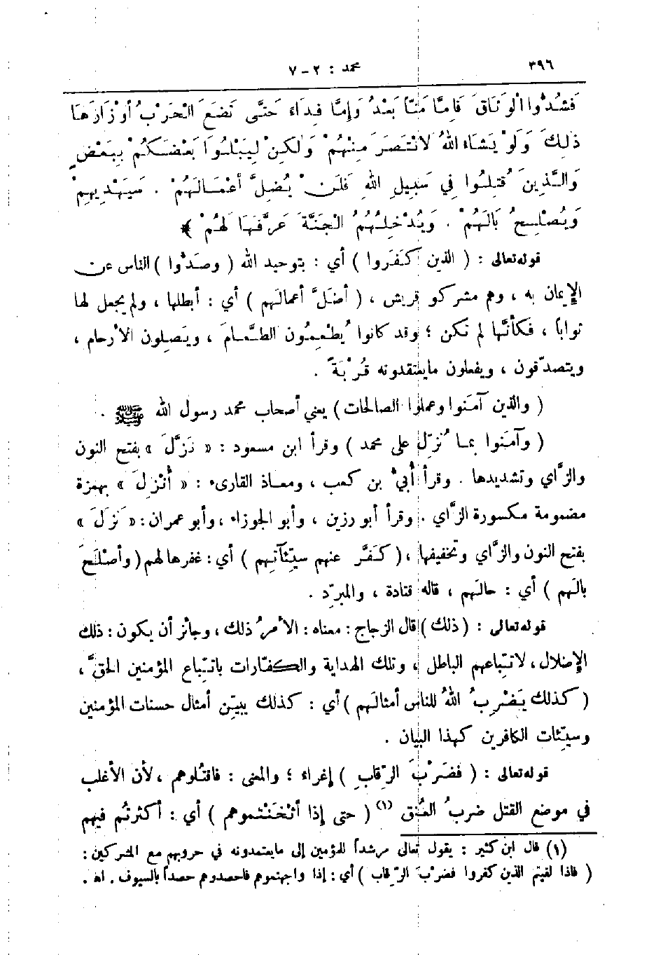قوله تعالى فضرب الرقاب إغراء والمعنى فاقتلوهم لان الأغلب في موضع القتل ضرب العنق حتى إذا أثخنتموهم أي أكثرتم فيهم