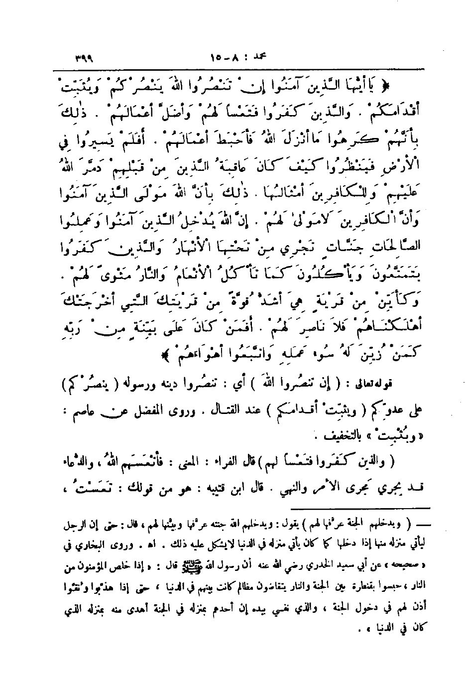 يا ايها الذين آمنوا إن تنصروا الله ينصركم ويثبت أقدامكم والذين كفروا فتعسا لهم وأضل أعمالهم ذلك بأنهم كرهوا ما أنزل الله فأحبط أعمالهم أفلم يسيروا في الأرض فينظروا كيف كان عاقبة الذين من قبلهم دمر الله عليهم وللكافرين أمثالها ذلك بأن الله مولى الذين آمنوا وأن الكافرين لا مولى لهم إن الله يدخل الذين آمنوا وعملوا الصالحات جنات تجري من تحتها الأنهار والذين كفروا يتمتعون ويأكلون كما تأكل الأنعام والنار مثوى لهم وكأين من قرية هي أشد قوة من قريتك التي أخرجتك أهلكناهم فلا ناصر لهم أفمن كان على بينة من ربه كمن زين له سوء عمله واتبعوا أهوائهم