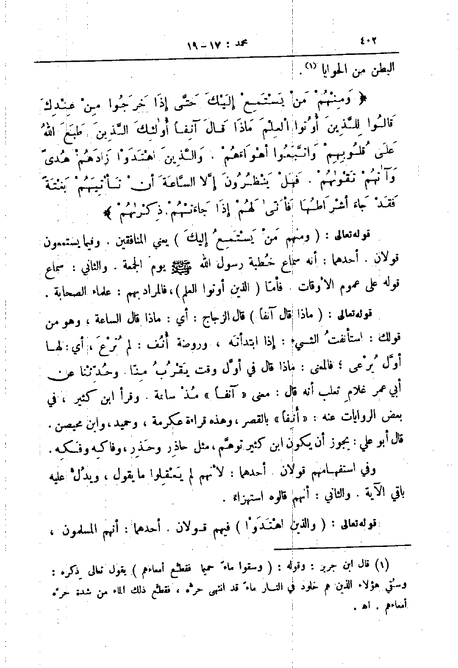 البطن من الحوايا ومنهم من يستمع إليك حتى إذا خرجوا من عندك قالوا للذين أوتوا العلم ماذا قال آنفا أولئك الذين طبع الله على قلوبهم واتبعوا أهواءهم والذين اهتدوا زادهم هدى وآتهم تقواهم فهل ينظرون إلا الساعة أن تأتيهم بغتة فقد جاء أشراطها فأنى لهم إذا جاءتهم ذكراهم