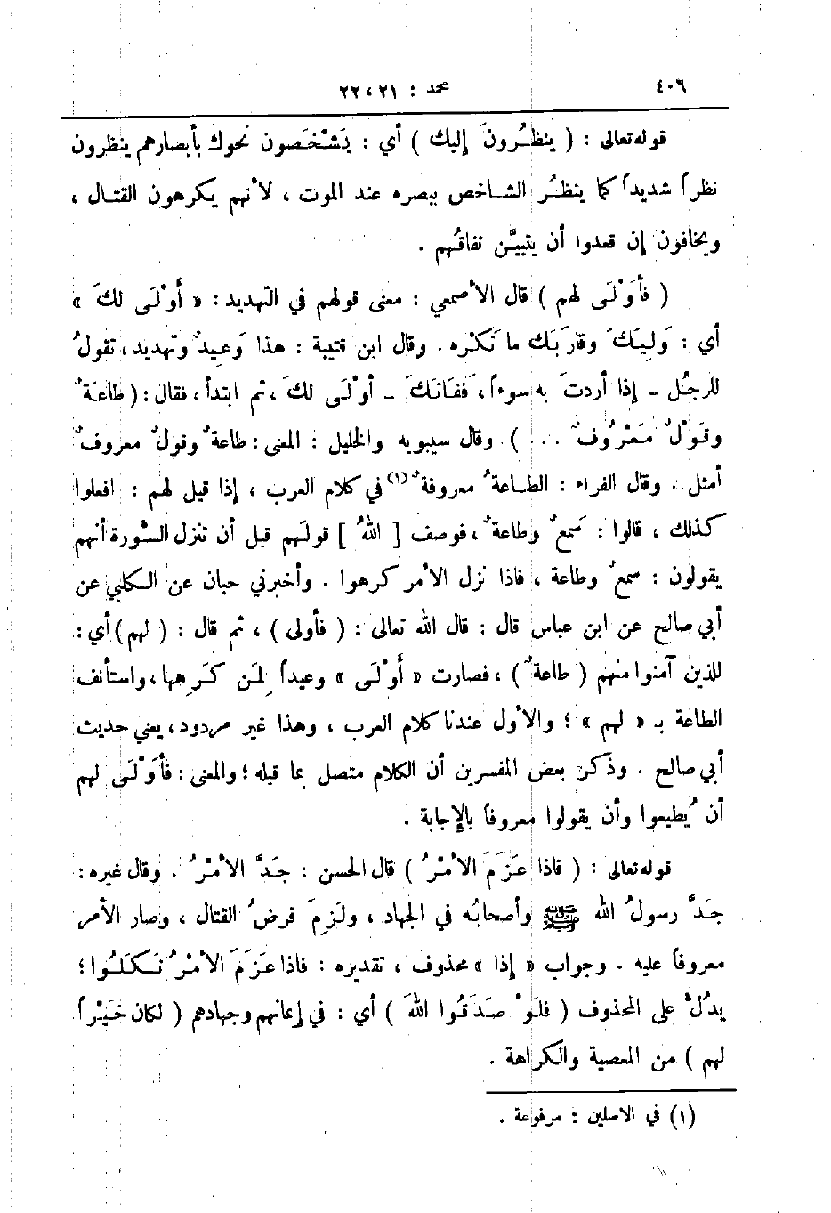 فأولى لهم قال الأصمعي معنى قولهم في التهديد أولى لك أي وليك وقاربك ما تكره وقال ابن قتيبة هذا وعيد وتهديد تقول للرجل إذا أردت به سوءا ففاتك أولى لك ثم ابتدأ فقال طاعة وقول معروف وقال سيبويه والخليل المعنى طاعة وقول معروف أمثل وقال الفراء الطاعة معروفة في كلام العرب إذا قيل لهم افعلوا كذلك قالوا سمع وطاعة فوصف الله قولهم قبل أن تنزل السورة أنهم يقولون سمع وطاعة فاذا نزل الأمر كرهوا وأخبروني حبان عن الكلبي عن أبي صالح عن ابن عباس قال قال الله تعالى فأولى ثم قال لهم أي للذين آمنوا منهم طاعة فصارت أولى وعيدا لمن كرهها واستأنف الطاعة ب لهم والأول عندنا كلام العرب وهذا غير مردود يعني حديث أبي صالح وذكر بعض المفسرين أن الكلام متصل بما قبله والمعنى فأولى لهم أن يطيعوا وأن يقولوا معروفا بالإجابة