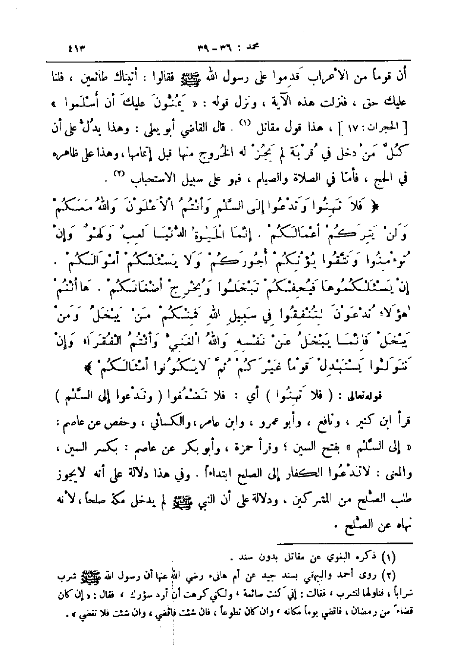 قوله تعالى فلا تهنوا أي فلا تضعفوا وتدعوا إلى السلم قرأ ابن كثير ونافع وأبو عمرو وابن عامر والكسائي وحفص عن عاصم إلى السلم بفتح السين وقرأ حمزة وأبو بكر عن عاصم بكسر السين والمعنى لا تدعوا الكفار إلى الصلح ابتداءا وفي هذا دلالة على أنه لا يجوز طلب الصلح من المشركين و دلالة على أن النبي صلى الله عليه و سلم لم يدخل مكة صلحا لأنه نهاه عن الصلح