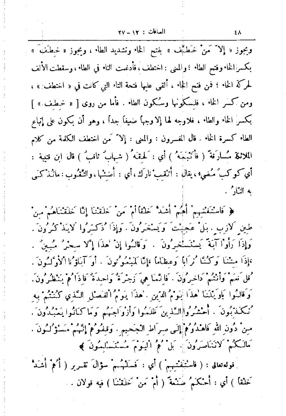 ويجوز إلا من خطف بفتح الخاء وتشديد الطاء ويجوز خطف بكسر الخاء وفتح الطاء والمعنى اختطف فأدغمت التاء في الطاء وسقطت الألف لحركة الخاء فمن فتح الخاء ألقى عليها فتحة التاء التي كانت في اختطف ومن كسر الخاء فلسكونها وسكون الطاء فأما من روى خطف بكسر الخاء والطاء فلا وجه لها إلا وجها ضعيفا جدا وهو أن يكون على إتباع الطاء كسرة الخاء قال المفسرون والمعنى إلا من اختطف الكلمة من كلام الملائكة مسارقة فأتبعه أي لحقه شهاب ثاقب قال ابن قتيبة أي كوكب مضيء يقال أثقب نارك أي أضئها والثقوب ما تذكى به النار