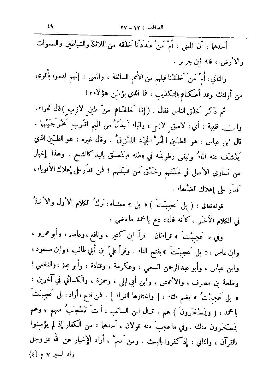 وفي عجبت قراءتان قرأ ابن كثير ونافع وعاصم وأبو عمرو وابن عامر بل عجبت بفتح التاء وقرأ علي بن أبي طالب وابن مسعود وابن عباس وأبو عبد الرحمن السلمي وعكرمة وقتادة وأبو مجلز والنخعي وطلحة بن مصرف والأعمش وابن أبي ليلى وحمزة والكسائي في آخرين بل عجبت بضم التاء واختارها الفراء فمن فتح أراد بل عجبت يا محمد ويسخرون هم قال ابن السائب أنت تعجب منهم وهم يسخرون منك وفي ما عجب منه قولان أحدهما من الكفار إذ لم يؤمنوا بالقرآن والثاني إذ كفروا بالبعث ومن ضم أراد الإخبار عن الله عز و جل