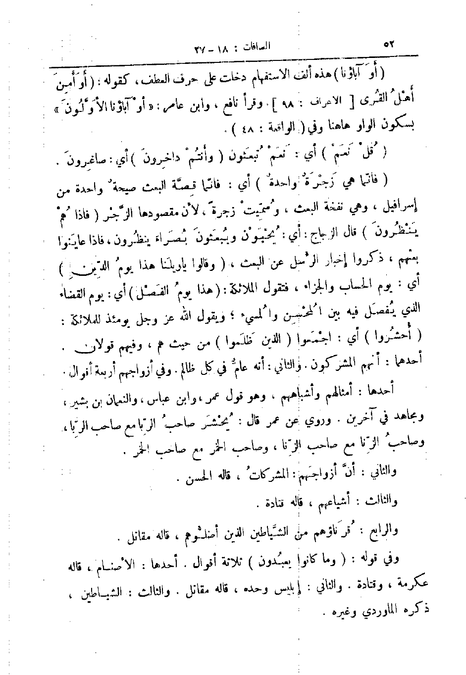 فانما هي زجرة واحدة أي فانما قصة البعث صيحة واحدة من إسرافيل وهي نفخة البعث وسميت زجرة لأن مقصودها الزجر فاذا هم ينظرون قال الزجاج أي يحيون ويبعثون بصراء ينظرون فاذا عاينوا بعثهم ذكروا إخبار الرسل عن البعث وقالوا يا ويلنا هذا يوم الدين أى يوم الحساب والجزاء فتقول الملائكة هذا يوم الفصل أي يوم القضاء الذي يفصل فيه بين المحسن والمسيء ويقول الله عز و جل يومئذ للملائكة احشروا أي اجمعوا الذين ظلموا من حيث هم وفيهم قولان أحدهما أنهم المشركون والثاني أنه عام في كل ظالم وفي أزواجهم أربعة أقوال