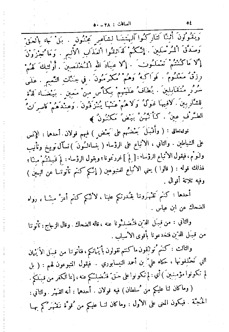 ويقولون أئنا لتاركوا آلهتنا لشاعر مجنون بل جاء بالحق وصدق المرسلين إنكم لذائقوا العذاب الأليم وما تجزون إلا ما كنتم تعلمون إلا عباد الله المخلصين أولئك لهم رزق معلوم فواكه وهم مكرمون في جنات النعيم على سرر متقابلين يطاف عليهم بكأس من معين بيضاء لذة للشاربين لا فيها غول ولا هم عنها ينزفون وعندهم قاصرات الطرف عين كأنهن بيض مكنون