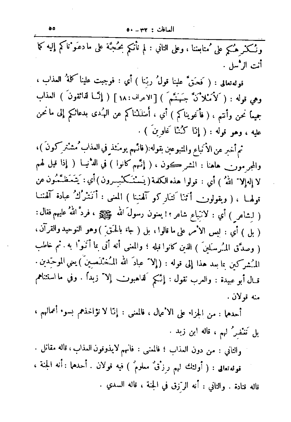 ثم أخبر عن الأتباع والمتبوعين بقوله فانهم يومئذ في العذاب مشتركون والمجرمون هاهنا المشركون إنهم كانوا في الدنيا إذا قيل لهم لا إله إلا الله أي قولوا هذه الكلمة يستكبرون أي يتعظمون عن قولها ويقولون أئنا لتاركو آلهتنا المعنى أنترك عبادة آلهتنا لشاعر أي لاتباع شاعر يعنون رسول الله صلى الله عليه و سلم فرد الله عليهم فقال بل أي ليس الأمر على ما قالوا بل جاء بالحق وهو التوحيد والقرآن وصدق المرسلين الذين كانوا قبله والمعنى أنه أتى بما أتوا به ثم خاطب المشركين بما يعد هذا إلى قوله إلا عباد الله المخلصين يعني الموحدين قال أبو عبيدة والعرب تقول إنكم لذاهبون إلا زيدا وفي ما استثناهم منه قولان