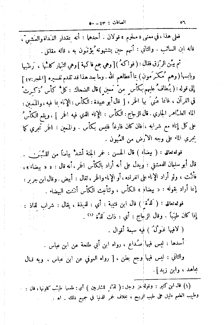 قوله تعالى بيضاء قال الحسن خمر الجنة أشد بياضا من اللبن قال أبو سليمان الدمشقي ويدل على أنه أراد بالكأس الخمر أنه قال بيضاء فأنث ولو أراد الإناء على انفراده أو الإناء والخمر لقال أبيض وقال ابن جرير إنما أراد بقوله بيضاء الكأس ولتأنيث الكأس أنثت البيضاء