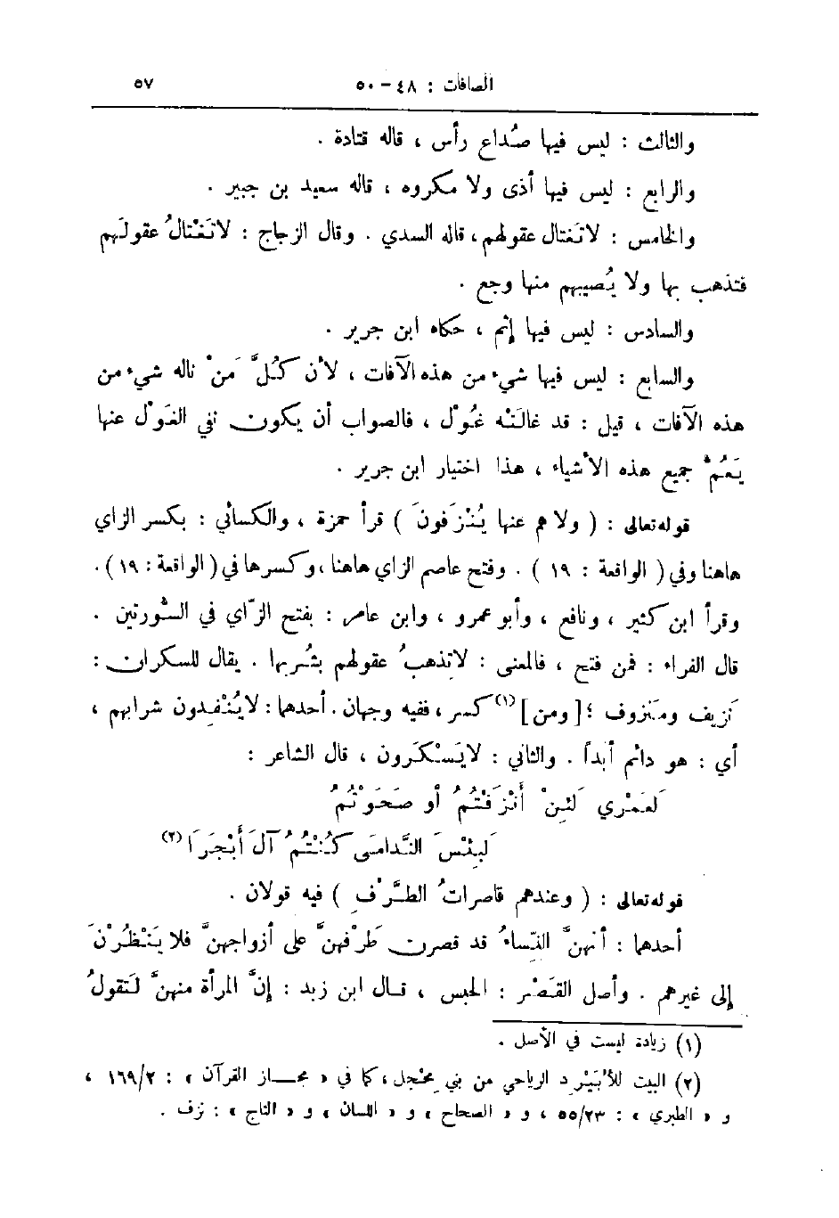 قوله تعالى ولاهم عنها ينزفون قرأ حمزة والكسائي بكسر الزاي هاهنا وفيه الواقعة 19 وفتح عاصم الزاي هاهنا وكسرها في الواقعة 19 وقرأ ابن كثير ونافع وأبو عمرو وابن عامر بفتح الزاي في السورتين قال الفراء فمن فتح فالمعنى لا تذهب عقولهم بشربها يقال للسكران نزيف ومنزوف ومن كسر ففيه وجهان أحدهما لا ينفدون شرابهم أي هو دائم أبدا والثاني لا يسكرون قال الشاعر ... لعمري لئن أنزفتم أو صحوتم ... لبئس الندامى كنتم آل أبجرا ...