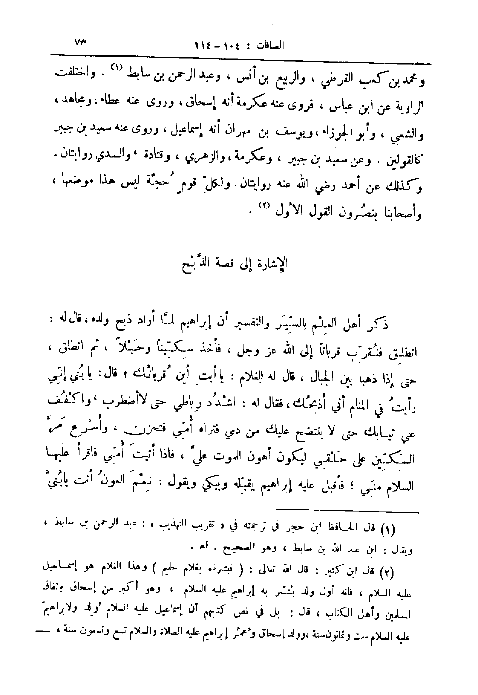 الإشارة إلى قصة الذبح ذكر أهل العلم بالسير والتفسير أن إبراهيم لما أراد ذبح ولده قال له انطلق فنقرب قربنا إلى الله عز و جل فأخذ سكينا وحبلا ثم انطلق حتى إذا ذهبا بين الجبال قال له الغلام يا أبت أين قربانك قال يا بني إني رأيت في المنام أني أذبحك فقال له اشدد رباطي حتى لا أضطرب واكفف عني ثيابك حتى لا ينتضح عليك من دمي فتراه أمي فتحزن واسرع مر السكين على حلقي ليكون أهون للموت علي فاذا أتيت أمي فاقرأ عليها السلام مني فأقبل عليه إبراهيم يقبله ويبكي ويقول نعم العون أنت يا بني