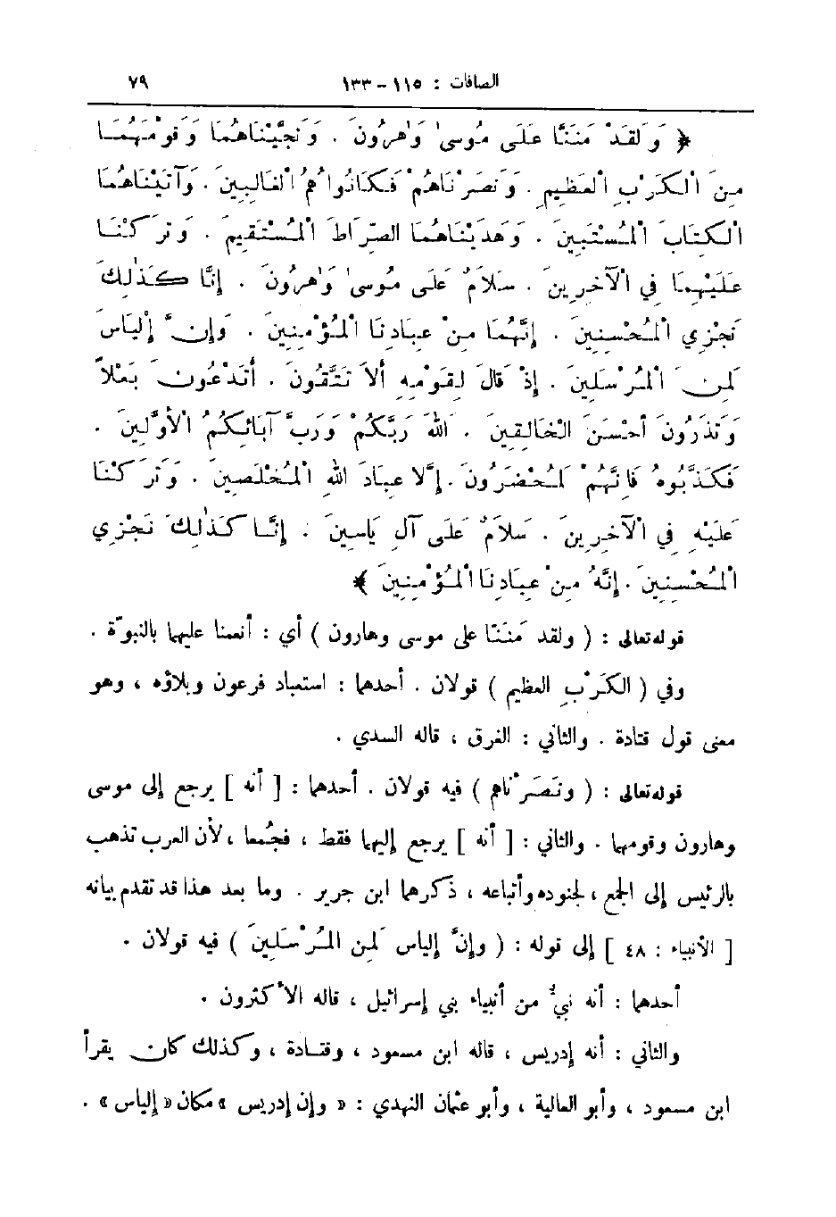 ولقد مننا على موسى وهارون ونجيناهما وقومهما من الكرب العظيم ونصرناهم فكانوا هم الغالبين وآتيناهما الكتاب المستبين وهديناهما الصراط المستقيم وتركنا عليهما في الآخرين سلام على موسى وهارون إنا كذلك نجزي المحسنين إنهما من عبدانا المؤمنين وإن إلياس لمن المرسلين إذ قال لقومه ألا تتقون أتدعون بعلا وتذرون أحسن الخالقين الله ربكم ورب آبائكم الأولين فكذبوه فإنهم لمحضرون إلا عباد الله المخلصين وتركنا عليه في الآخرين سلام على آل ياسين إنا كذلك نجزي المحسنين إنه من عبادنا المؤمنين
