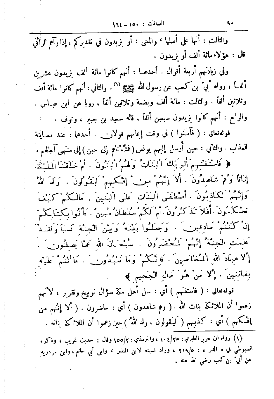 فاستفتهم ألربك البنات ولهم البنون أم خلقنا الملائكة إناثا وهم شاهدون ألا إنهم من إفكهم ليقولون ولد الله وإنهم لكاذبون أصطفى البنات على البنين ما لكم كيف تحكمون أفلا تذكرون أم لكم سلطان مبين فأتوا بكتابكم إن كنتم صادقين وجعلوا بينه وبين الجنة نسبا ولقد علمت الجنة إنهم لمحضرون سبحان الله عما يصفون إلا عباد الله المخلصين فإنكم وما تعبدون ما أنتم عليه بفاتنين إلا من هو صال الجحيم