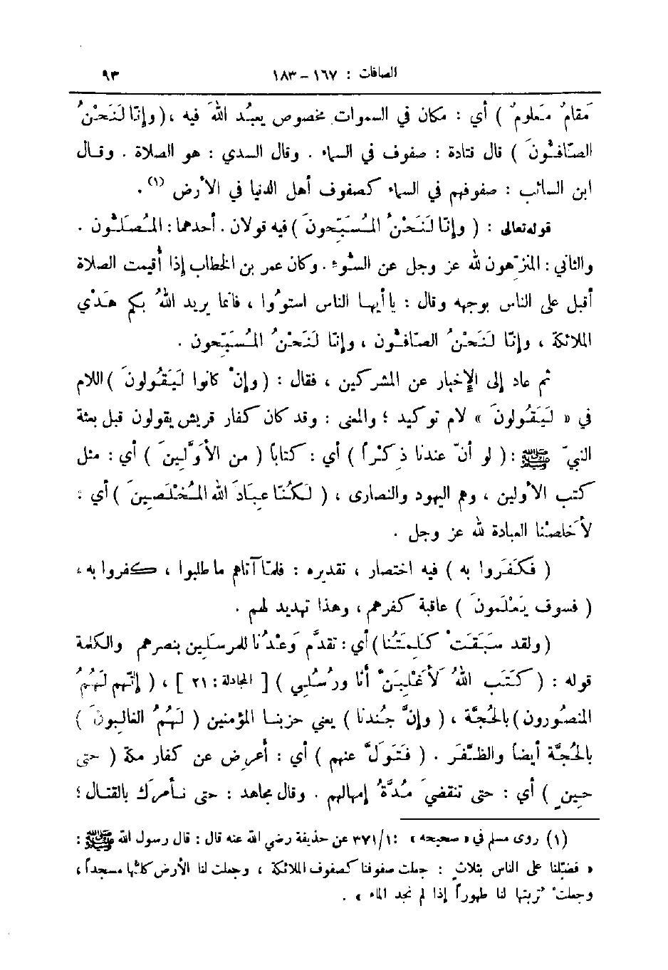 قوله تعالى وإنا لنحن المسبحون فيه قولان أحدهما المصلون والثاني المنزهون لله عز و جل عن السوء وكان عمر بن الخطاب إذا أقيمت الصلاة أقبل على الناس بوجهه وقال يا أيها الناس استووا فإنما يريد الله بكم هدي الملائكة وإنا لنحن الصافون وإنا لنحن المسبحون