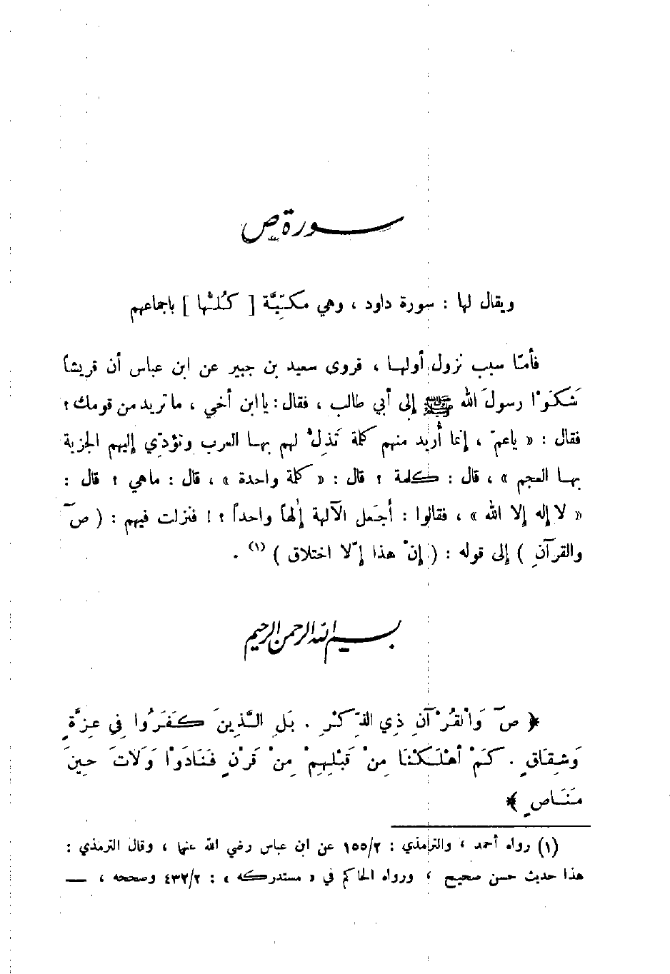 فأما سبب نزول أولها فروى سعيد بن جبير عن ابن عباس أن قريشا شكوا رسول الله صلى الله عليه و سلم إلى أبي طالب فقال يا ابن أخي ما تريد من قومك فقال يا عم إنما اريد منهم كلمة تذل لهم بها العرب وتؤدي إليهم الجزية بها العجم قال كلمة قال كلمة واحدة قال ماهي قال لا إله إلا الله فقالوا أجعل الآلهة إلها واحدا فنزلت فيهم ص والقرآن إلى قوله إن هذا إلا اختلاق بسم الله الرحمن الرحيم