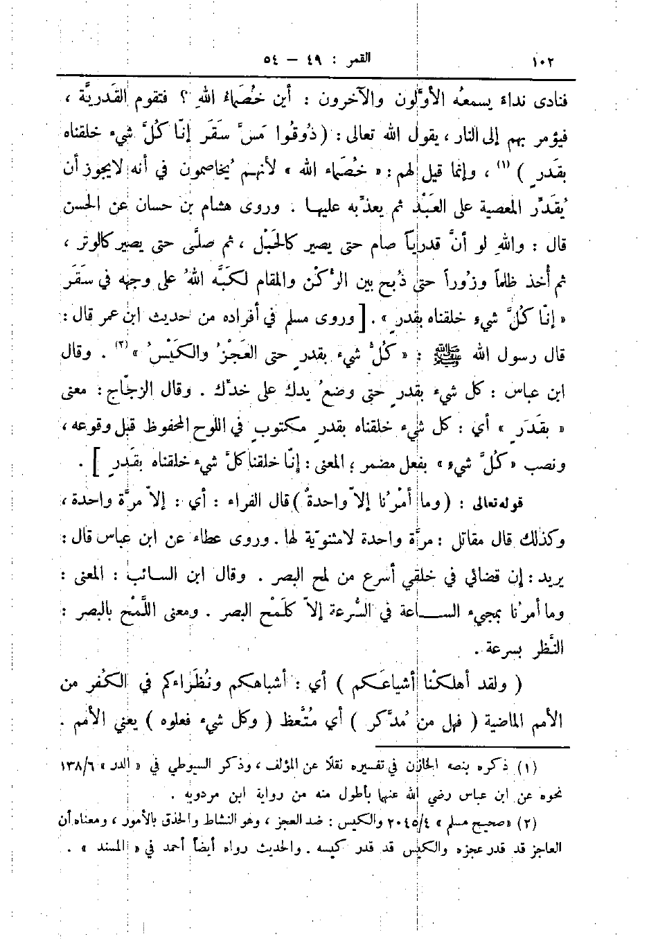 فنادى نداء يسمعه الأولون والآخرون أين خصماء الله فتقوم القدرية فيؤمر بهم إلى النار يقول الله تعالى ذوقوا مس سقر إنا كل شيء خلقناه بقدر وإنما قيل لهم خصماء الله لأنهم يخاصمون في أنه لا يجوز أن يقدر المعصية على العبد ثم يعذبه عليها وروى هشام بن حسان عن الحسن قال والله لو أن قدريا صام حتى يصير كالحبل ثم صلى حتى يصير كالوتر ثم أخذ ظلما وزورا حتى ذبح بين الركن والمقام لكبه الله على وجهه في سقر إنا كل شيء خلقناه بقدر وروى مسلم في أفراده من حديث ابن عمر قال قال رسول الله صلى الله عليه و سلم كل شيء بقدر حتى العجز والكيس وقال ابن عباس كل شيء بقدر حتى وضع يدك على خدك وقال الزجاج معنى بقدر أي كل شيء خلقناه بقدر مكتوب في اللوح المحفوظ قبل وقوعه ونصب كل شيء بفعل مضمر المعنى إنا خلقنا كل شيء خلقناه بقدر
