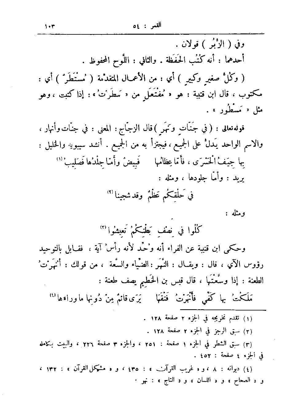 قوله تعالى في جنات ونهر قال الزجاج المعنى في جنات وأنهار والاسم الواحد يدل على الجميع فيجتزأ به من الجميع أنشد سيبويه والخليل ... بها جيف الحسرى فأما عظامها ... فبيض وأما جلدها فصليب ...