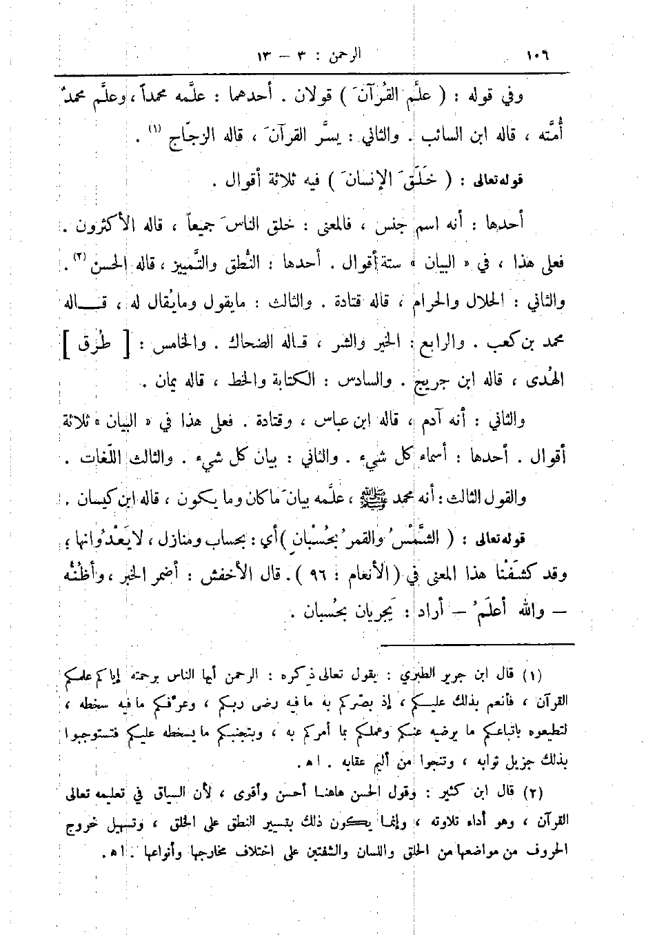 والقول الثالث أنه محمد صلى الله عليه و سلم علمه بيان ما كان وما يكون قاله ابن كيسان قوله تعالى الشمس والقمر بحسبان أي بحساب ومنازل لا يعدوانها وقد كشفنا هذا المعنى في الأنعام 96 قال الأخفش أضمر الخبر وأظنه والله أعلم أراد يجريان بحسبان
