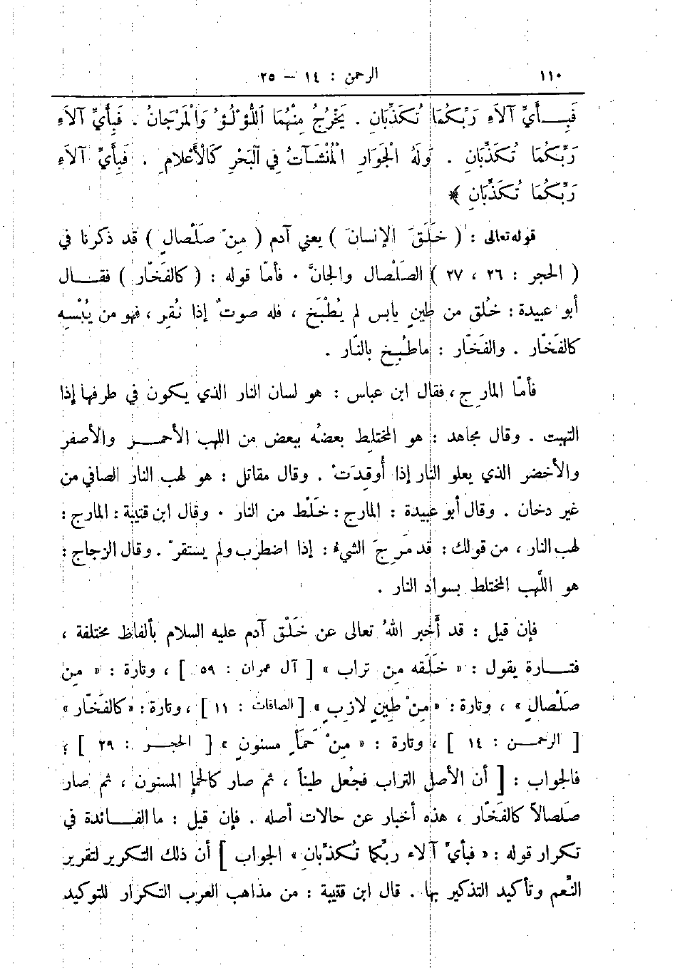 فإن قيل قد أخبر الله تعالى عن خلق آدم عليه السلام بألفاظ مختلفة فتارة يقول خلقه من تراب آل عمران 59 وتارة من صلصال وتارة من طين لازب الصافات 11 وتارة كالفخار الرحمن 14 وتارة من حمأ مسنون الحجر 29 فالجواب أن الأصل التراب فجعل طينا ثم صار كالحمإ المسنون ثم صار صلصالا كالفخار هذه أخبار عن حالات أصله فإن قيل ما الفائدة في تكرار قوله فبأي آلاء ربكما تكذبان الجواب أن ذلك التكرير لتقرير النعم وتأكيد التذكير بها قال ابن قتيبة من مذاهب العرب التكرار للتوكيد